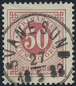Sweden. Facit 36d used, 50 öre dull violetish carmine. Superb cancellation SVANESUND 27.5.1883. Some ink on the reverse.