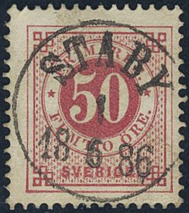 Sweden. Facit 36h used, 50 öre carmine-rose on calendered paper. EXCELLENT cancellation STABY 1.6.1886.