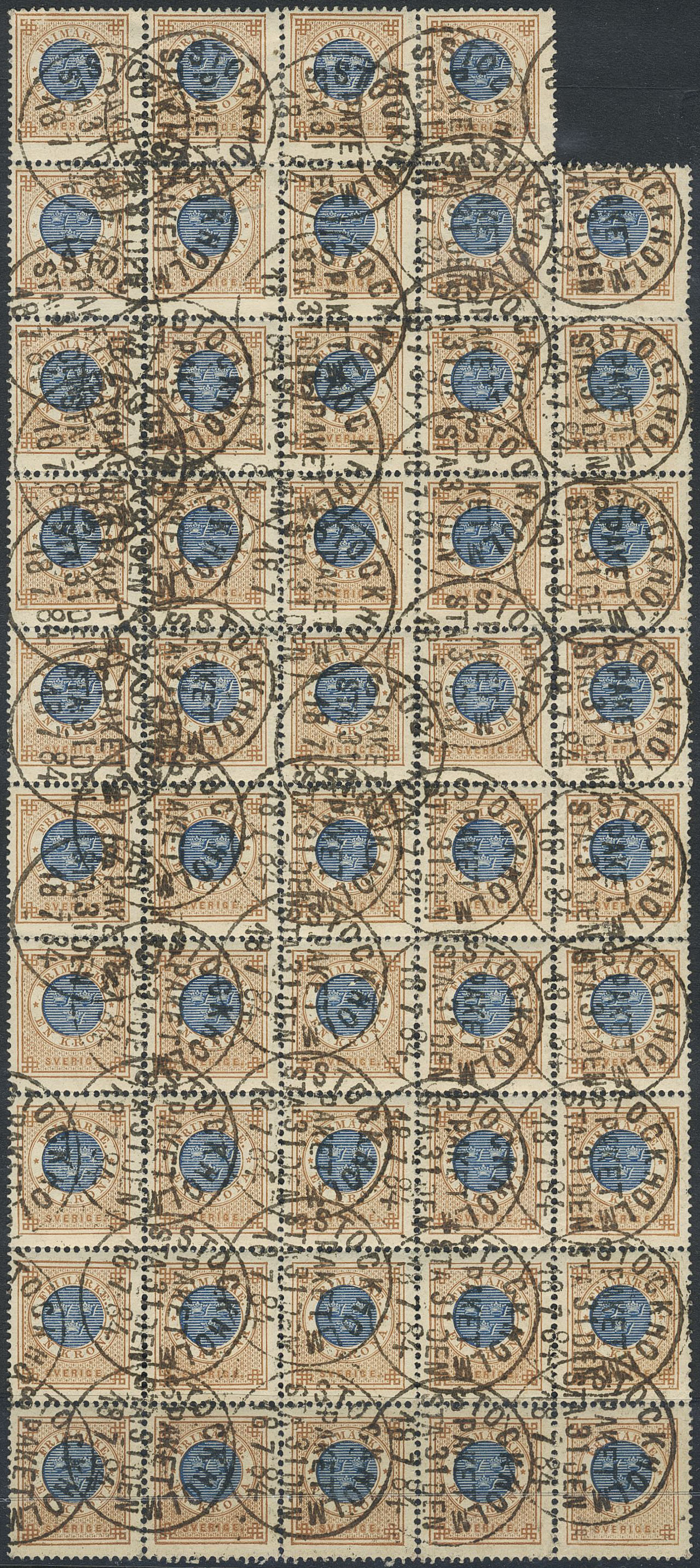 Sweden. Facit 38 used, 1 Krona brown/blue in block of 49.
