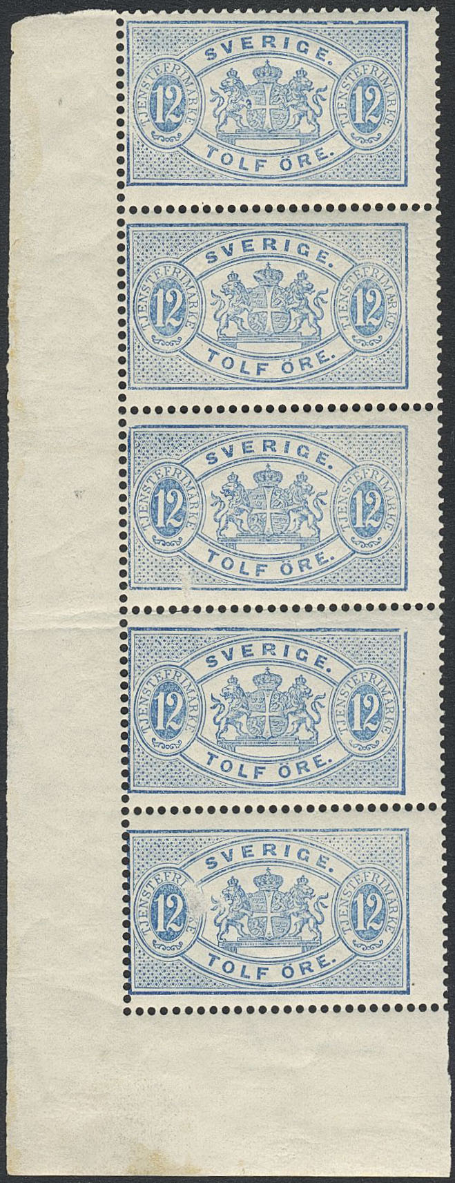 Sweden. Official Facit Tj17 ★★, 12 öre blue, perf 13. Strip of 5 with bottom and left margins. Two thin spots and slightly disturbed gum. SEK 6000