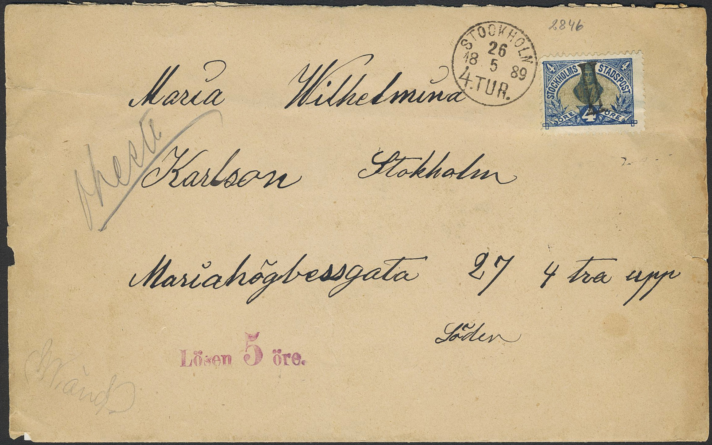 Sweden. Postage due Facit L13a on cover, 5 öre as postage due on local cover, prepaid with a local post 'STOCKHOLMS STADSPOST' stamp 5 öre, then taxed and paid with 5 öre STOCKHOLM 27.5.1889 after the letter was dropped in the wrong box. Postage due mark Lösen 5 örein violet colour. Interesting item.