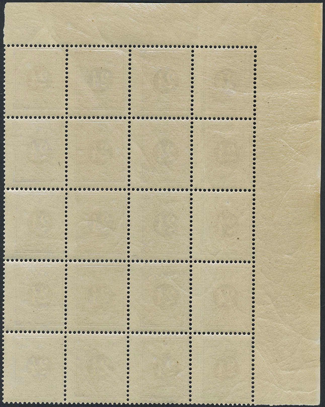 Sweden. Postage due Facit L17 ★★, 24 öre lilac, perf 13. Upper left section of a sheet (20 stamps) with margins both on the top and to the left.