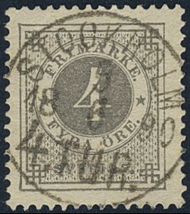 Sweden. Facit 42e used, 4 öre light grey on yellowish. EXCELLENT cancellation STOCKHOLM 4.TUR 3.6.1890.