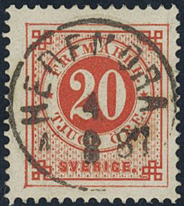 Sweden. Facit 46c used, 20 öre dark orange-red. EXCELLENT cancellation HEDEMORA 4.8.1887.