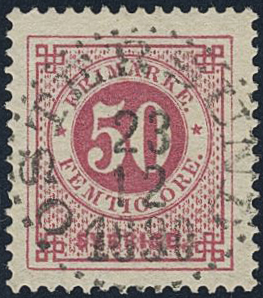 Sweden. Facit 48b used, 50 öre carmine, even print. EXCELLENT cancellation ÖSTERSUND 23.12.1890. Slightly short perf.
