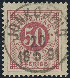 Sweden. Facit 48d used, 50 öre dull carmine on yellowish paper. EXCELLENT cancellation JÖNKÖPING 20.5.1891. Signed by O.P.