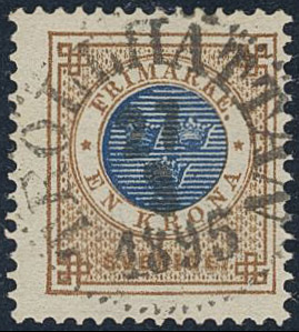 Sweden. Facit 49b used, 1 Krona yellowish brown/dark blue on yellowish paper. Superb cancellation TROLLHÄTTAN 27.3.1895.