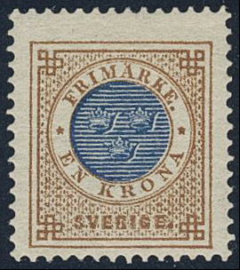 Sweden. Facit 49c ★, 1 Krona orange-brown/dark blue on yellowish paper. Very fine. SEK 900