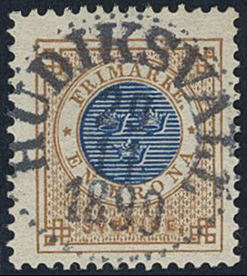 Sweden. Facit 49c used, 1 Krona orange-brown/dark blue on yellowish paper. Superb cancellation HUDIKSVALL 29.11.1890.