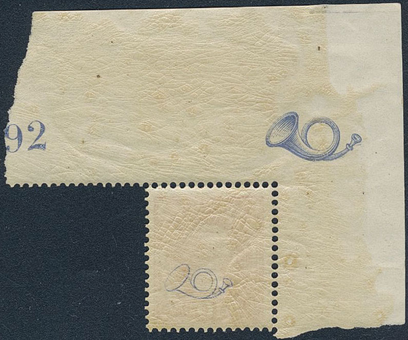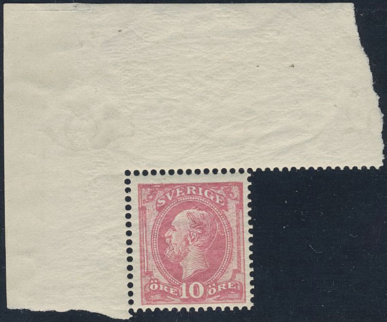 Sweden. Facit 45 ★★, 10 öre Oscar II letterpress with blue posthorn on reverse with corner sheet margin, with margin posthorn and part of control number. SEK 2200+