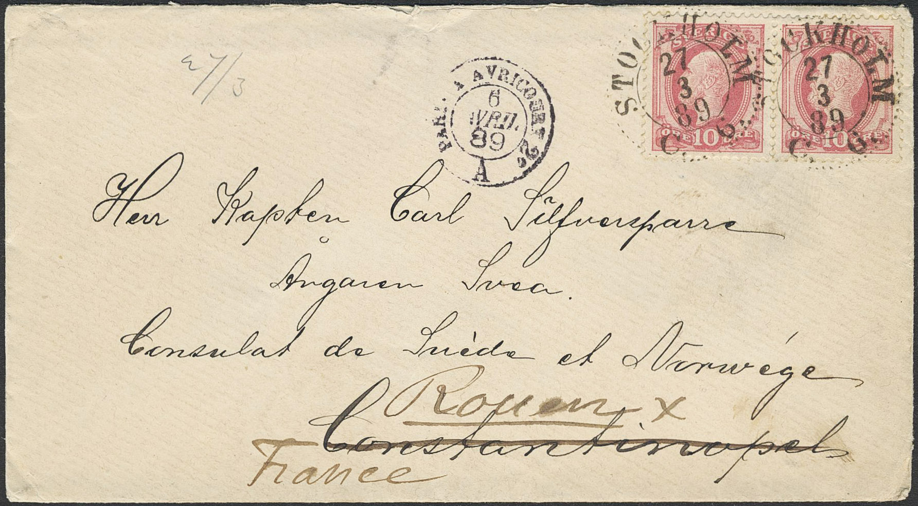 Sweden. Facit 45 on cover, 2×10 öre on very beautiful cover sent from STOCKHOLM 27.3.1889 to the Ottoman Empire. Forwarded from CONSTANTINOPEL DEUTSCHE POST 2.4.89 to France.