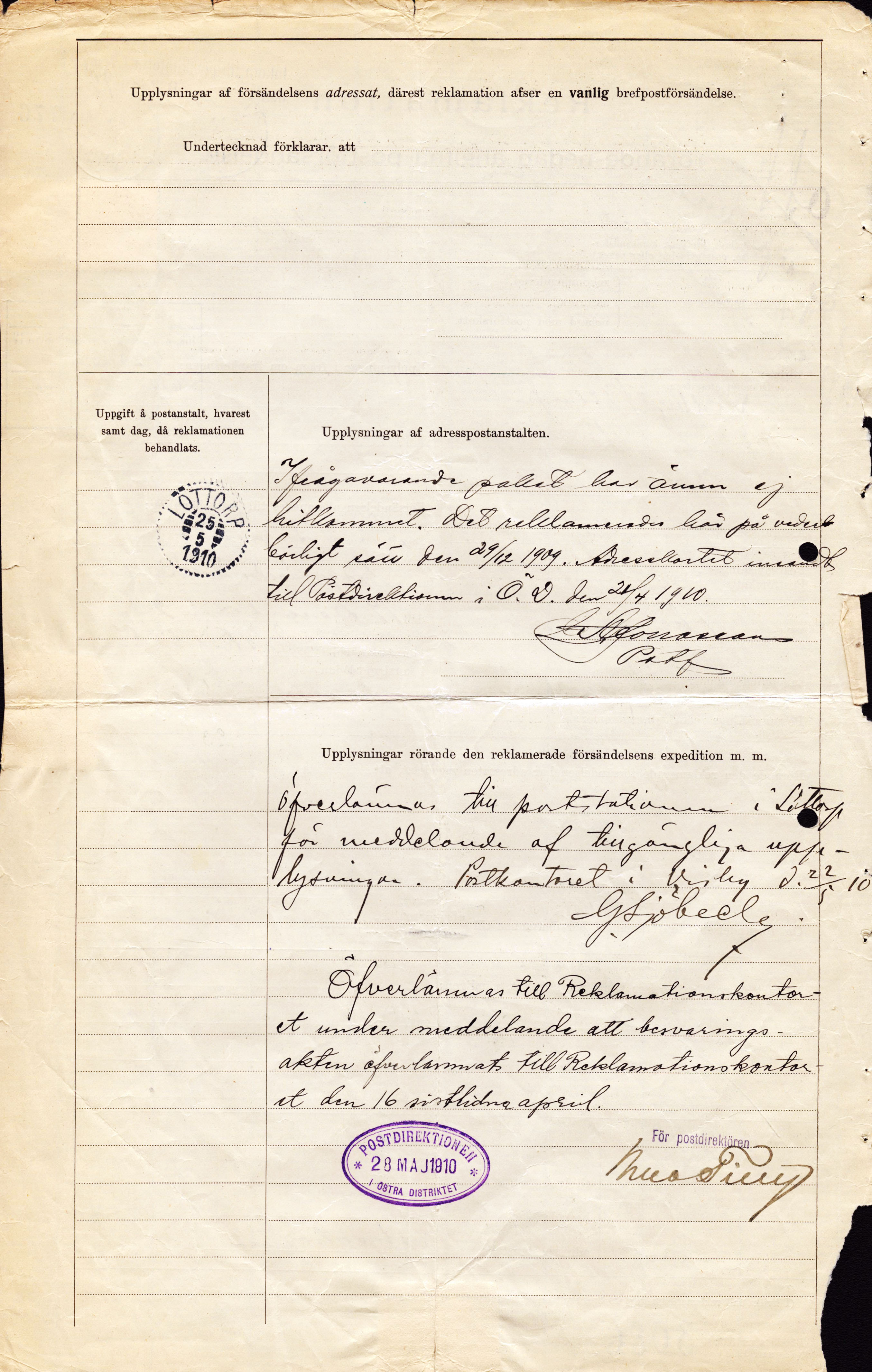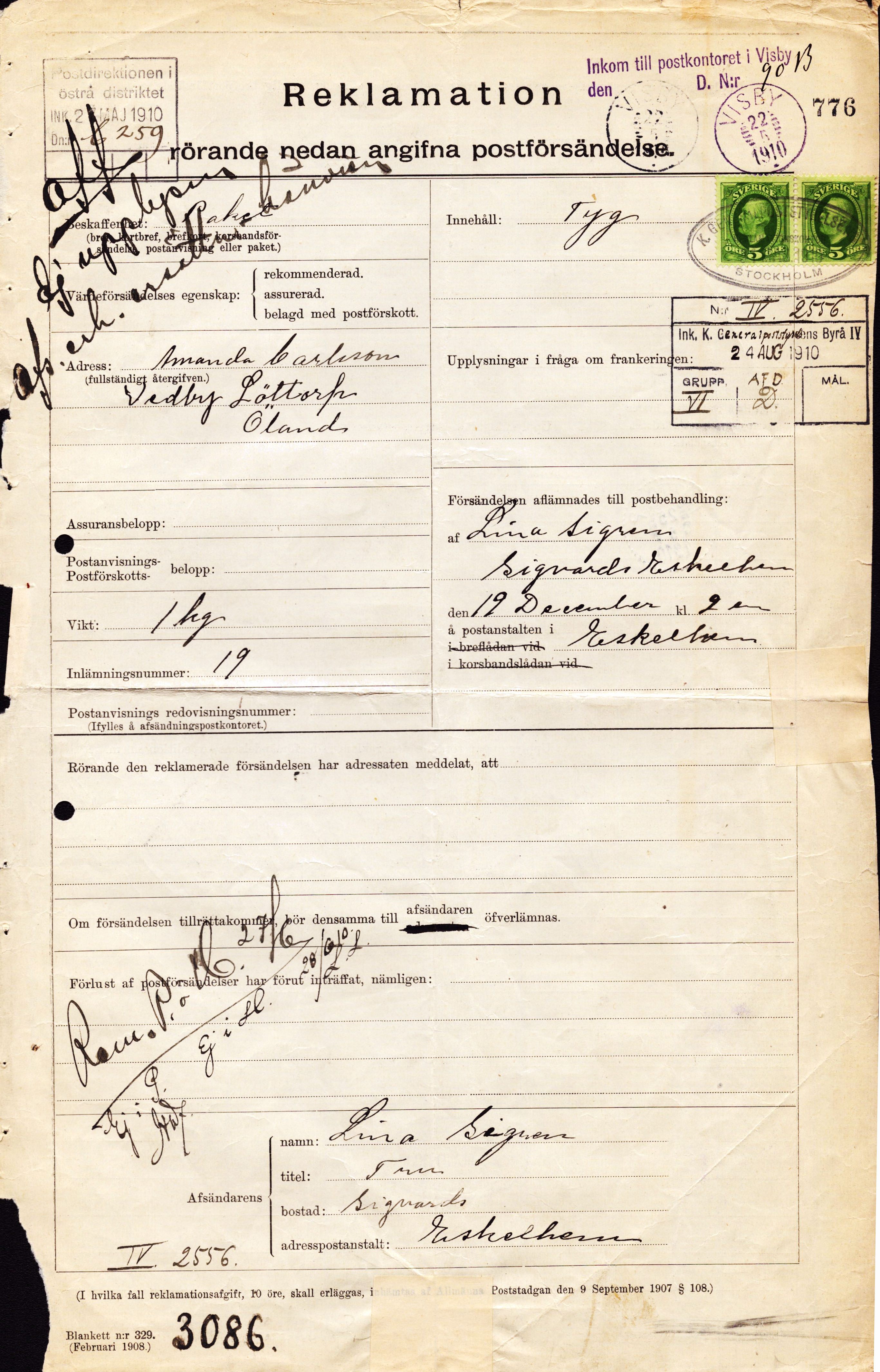 Sweden. Facit 52 on cover, 2×5 öre on 'Reklamation' used for a missing parcel sent from Eskelhem; gotland to Öland. The postal form is cancelled VISBY 22.5.1910 (in VIOLET colour) and LÖTTORP 25.5.1910. Small imperfections as usual.