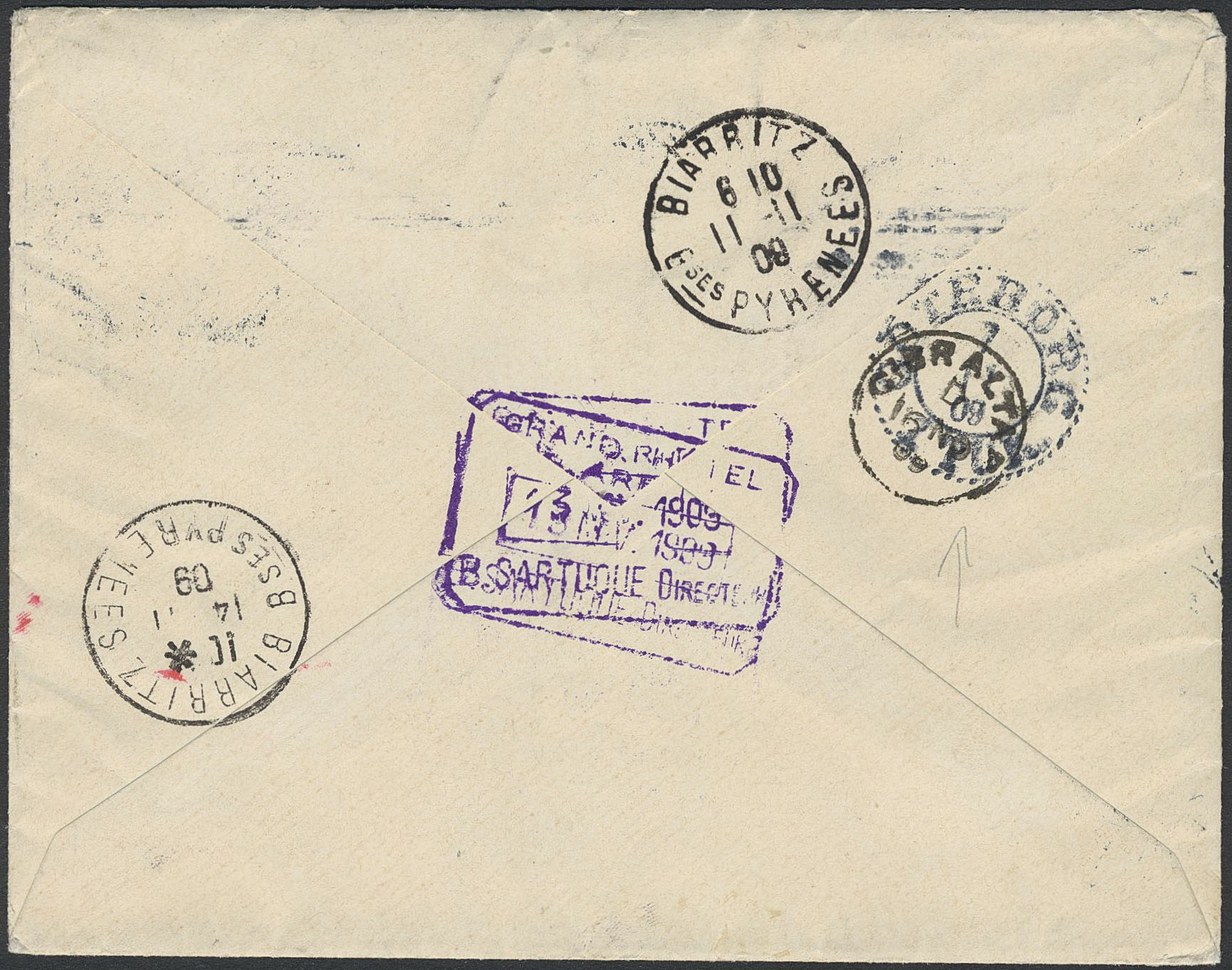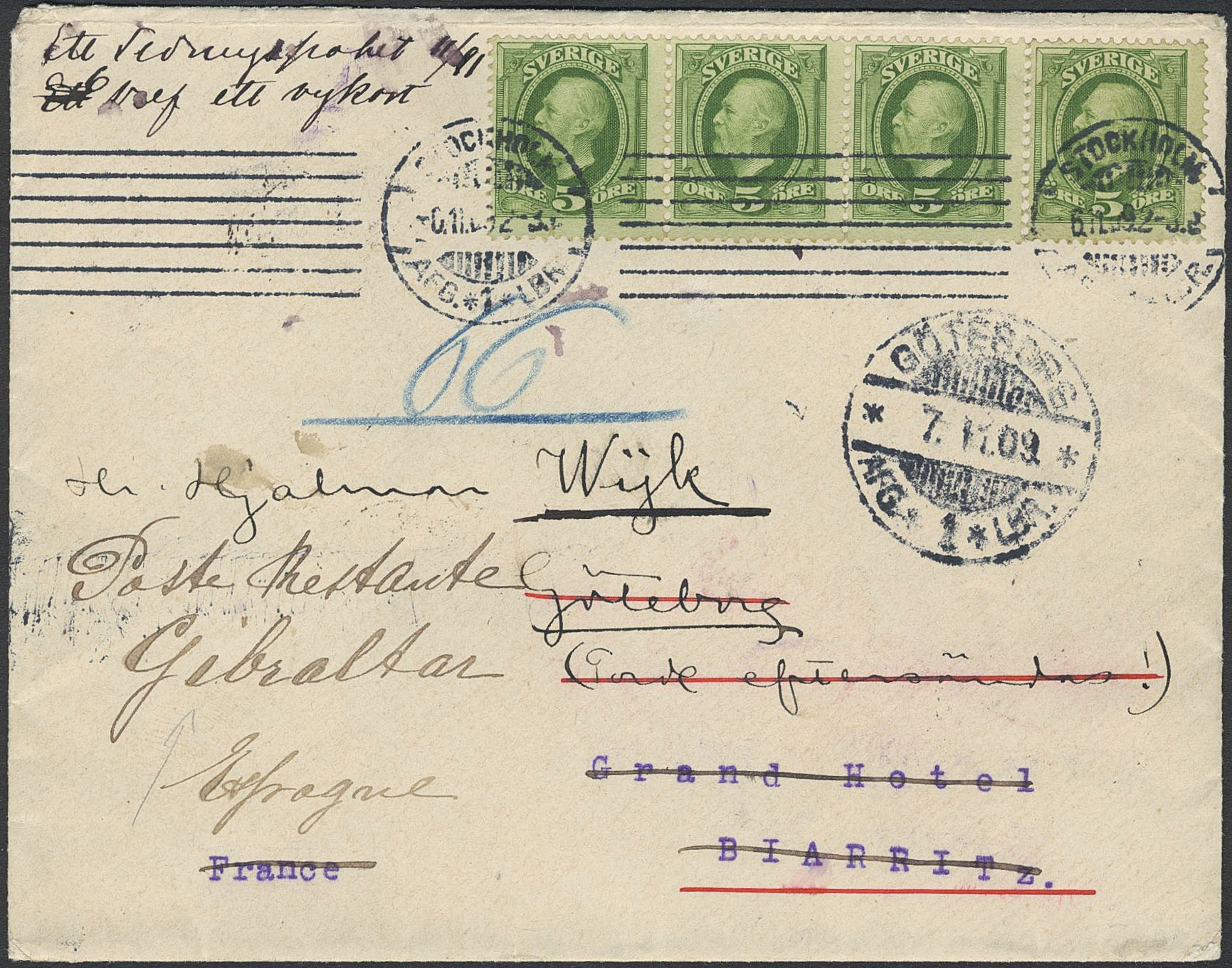 Sweden. Facit 52 on cover, 4×5 öre on interesting cover sent from STOCKHOLM 6.11.09 to GRAND HOTEL 13.NOV.1909, France, then forwarded to GÖTEBORG 7.11.09 and finally to GIBRALTAR 16.NO.09.