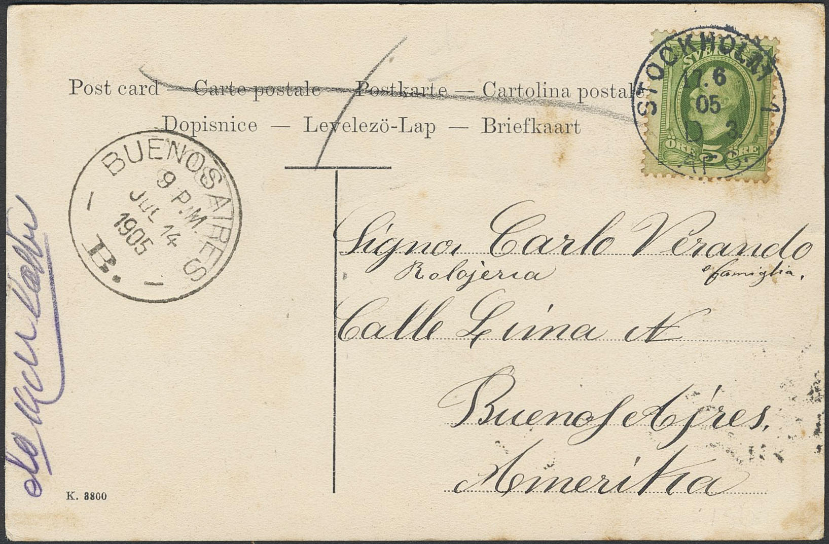 Sweden. Facit 52 on cover, 5 öre on picture postcard ('Vaktparaden på Göta Lifgardes Kaserngård'), sent as printed matter from STOCKHOLM 17.6.05 to BUENOS AIRES B 14.JUL.1905. Scrace destination for pm mail.