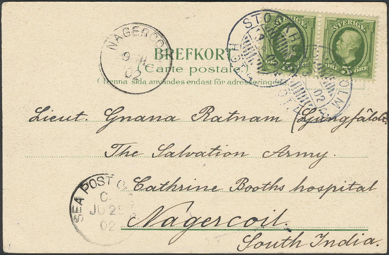 Sweden. Facit 52 on cover, 2×5 öre on postcard sent from STOCKHOLM 13.6.02 to NAGERCOIL 9.JU.02 to South India, via SEA POST OFFICE C 29.JU.02.