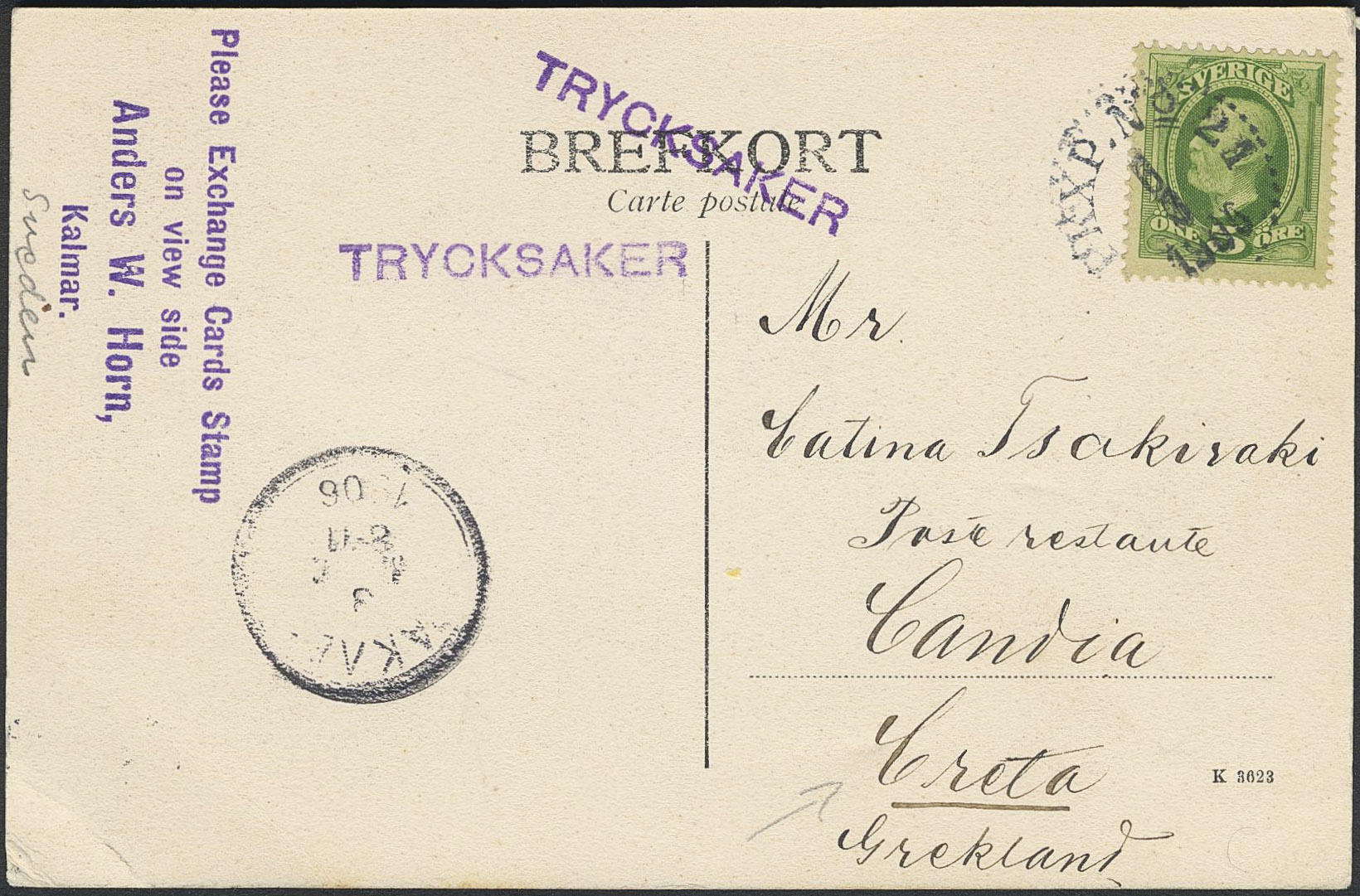 Sweden. Facit 52 on cover, 5 öre on printed matter card sent from PKXP No 24 6.3.1906 to Crete with arrival pmk.