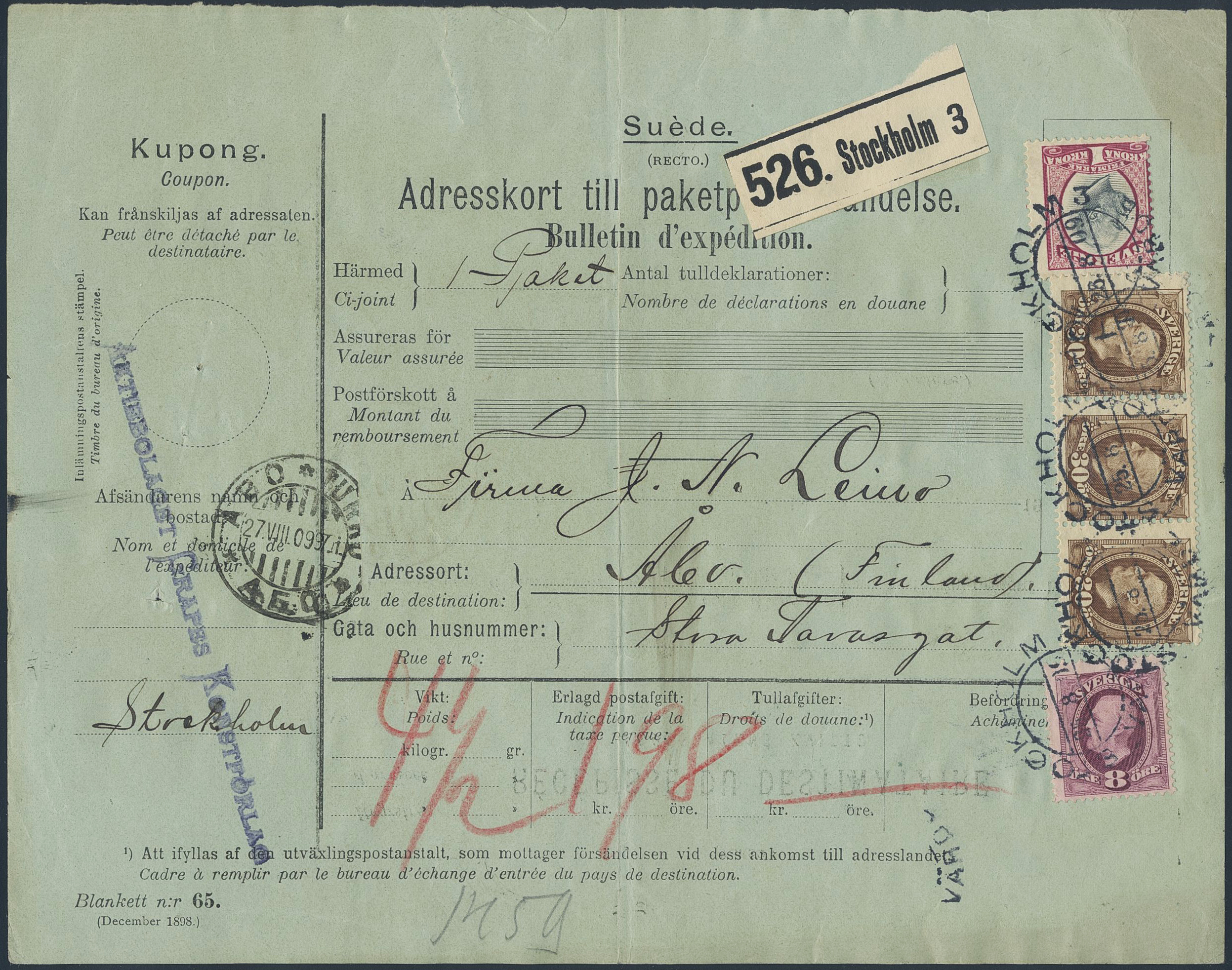 Sweden. Facit 53, 58, 60 on cover, 8+3×30 öre + 1 kr on address card for parcel sent from STOCKHOLM 25.8.09 to Finland, with arrival pmk ÅBO TURKU 27.VIII.09.