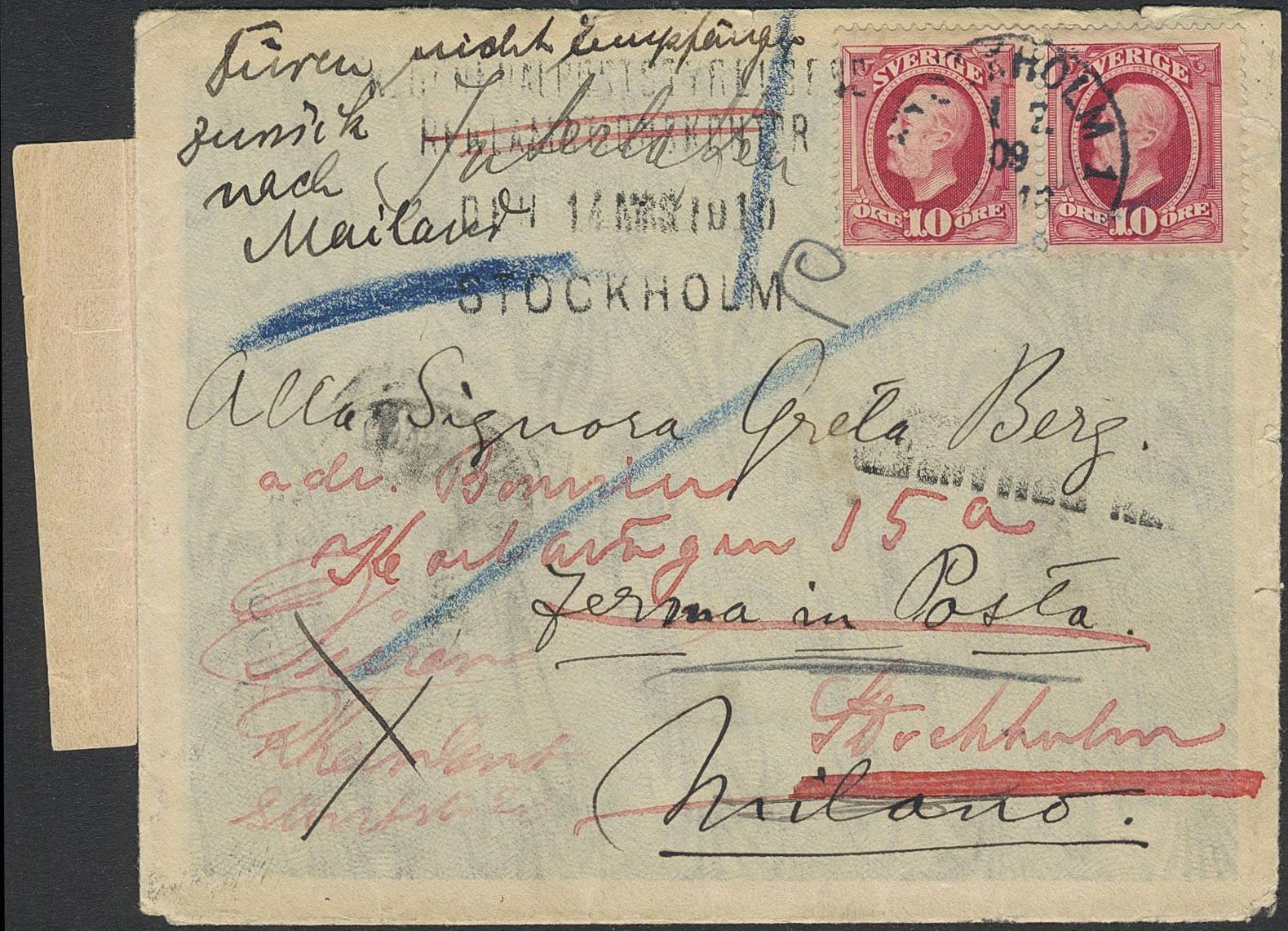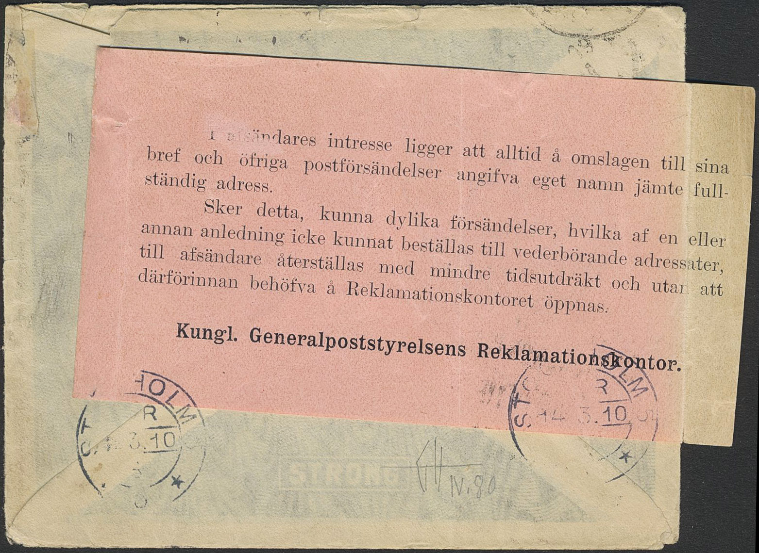Sweden. Facit 54 on cover, 2×10 öre on cover sent from STOCKHOLM 1.7.09 to Italy. Undeliverable with label from 'Kungl. Generalpoststyrelsens Reklamationskontor'.