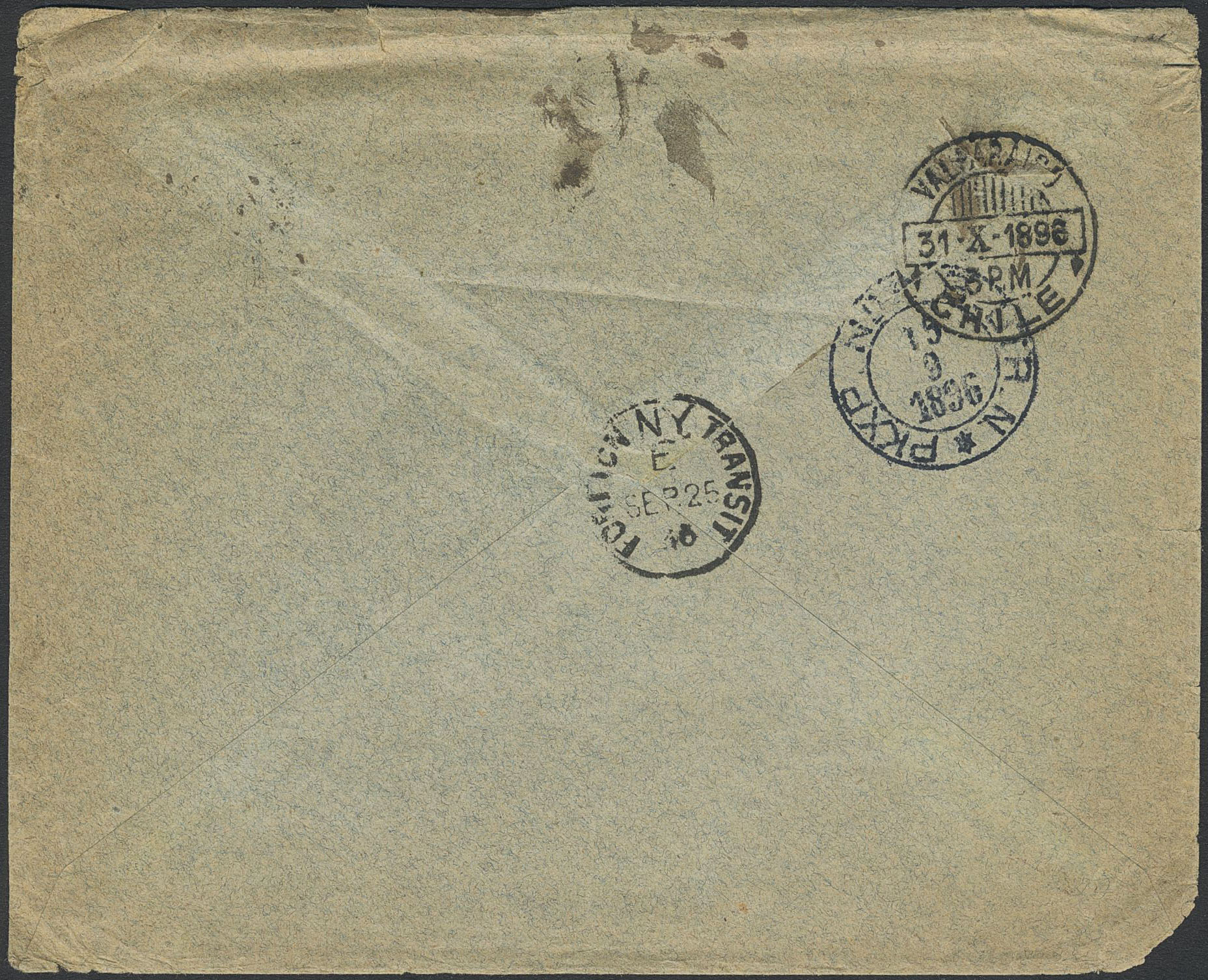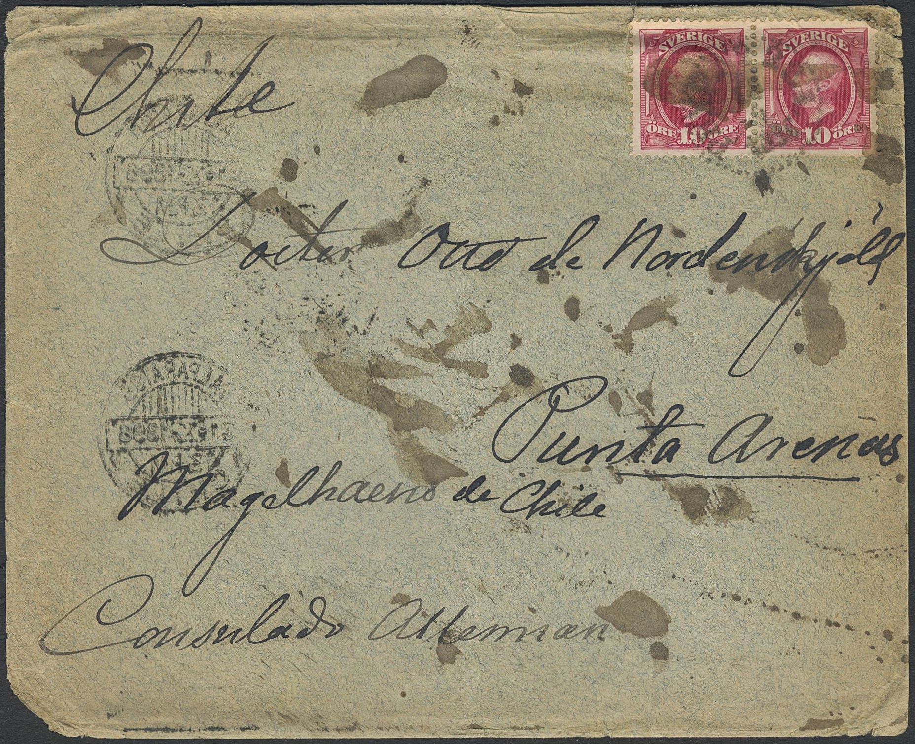 Sweden. Facit 54 on cover, 2×10 öre on cover sent to Otto Nordenskjöld during his mineralogical expedition in the Patagonian area in Chile, with transit pmks FOREIGN N.Y: TRANSIT 25.SEP.96 and VALPARAISO CHILE 31.X.1896. Between 1901 and 1904 he also led the Swedish Antarctic Expedition. Sought after item.