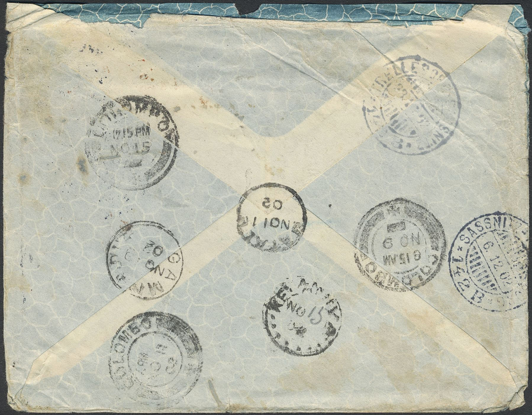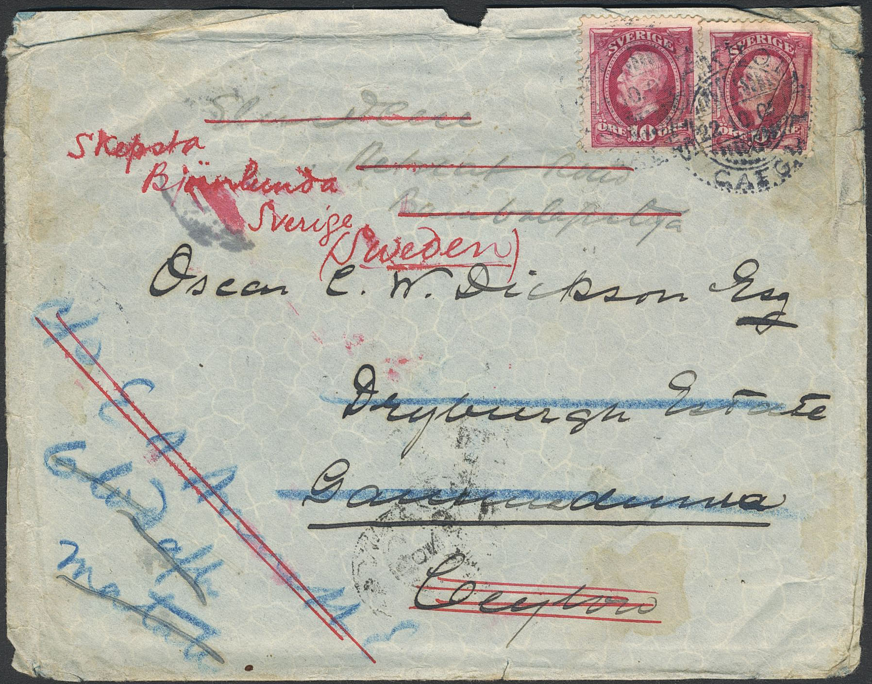 Sweden. Facit 54 on cover, 2×10 öre on nice cover sent from STOCKHOLM 22.10.02 to Ceylon, then forwarded to Bambalapitiya, then to MATALE11.NO.02, then finally to Björnlunda, Sweden. Eight cancels on the reverse. Some imperfections.
