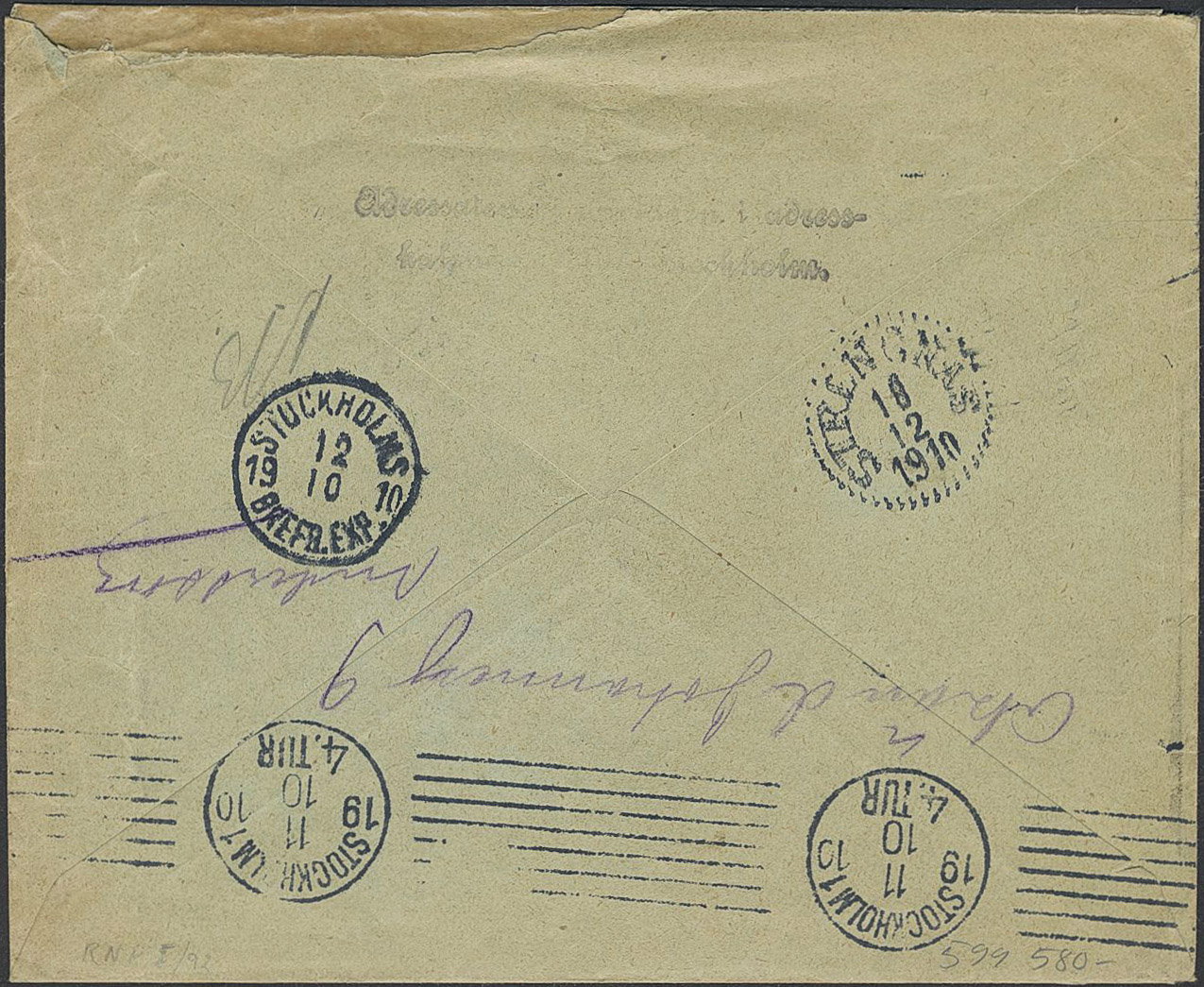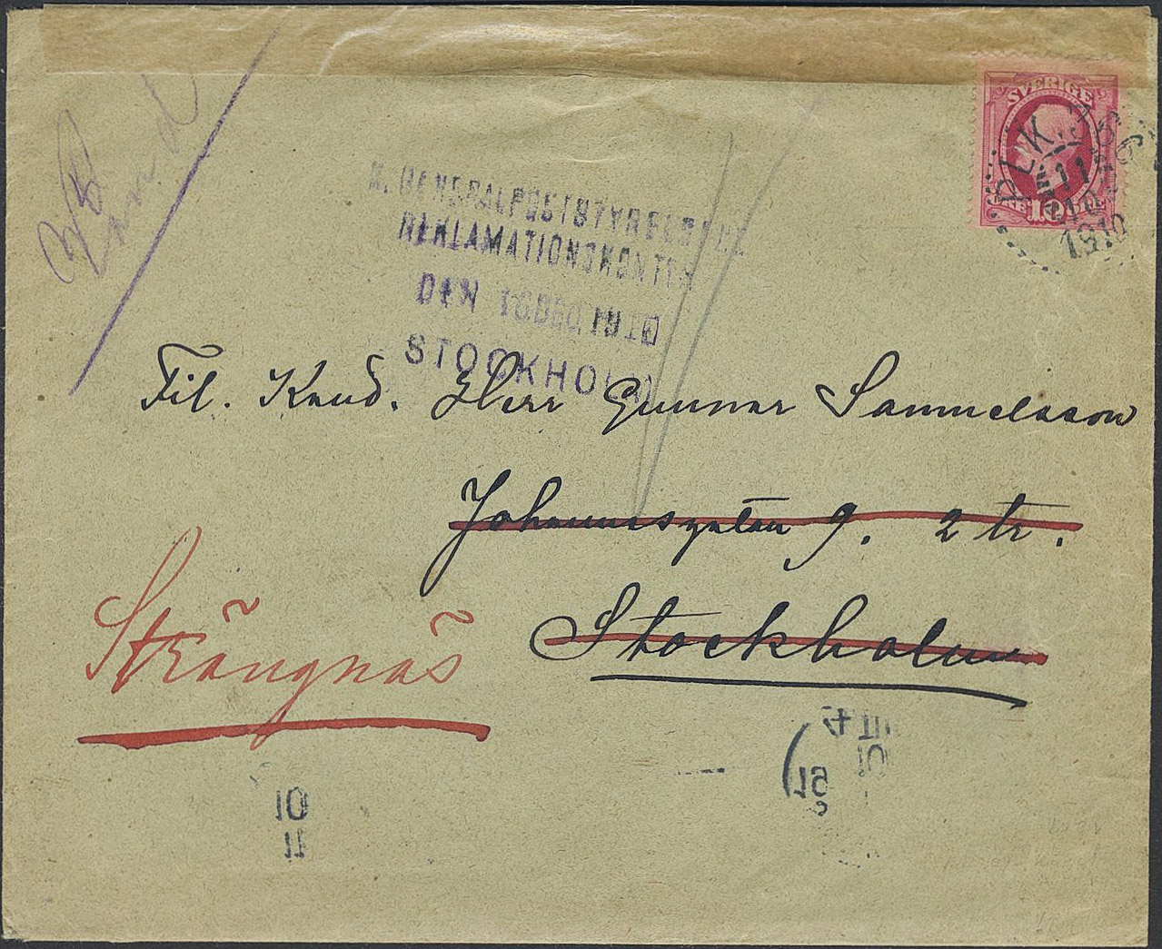 Sweden. Facit 54 on cover, 1891 Oscar II 10 öre red. Canc. PLK 366 11.10.1910. The letter has been opened by the post office in Stockholm to find the sender.
