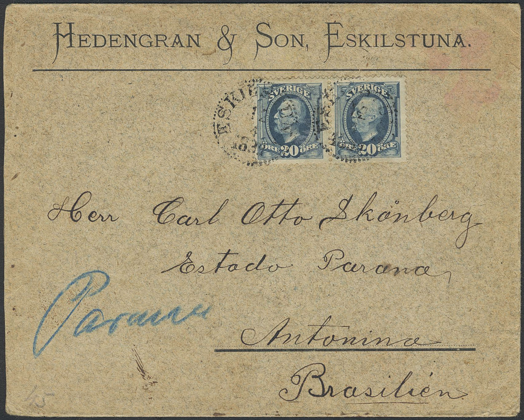 Sweden. Facit 56 on cover, 2×20 öre on cover with double postage, sent from ESKILSTUNA 12.4.1899 via TRELLEBORG-SASSNITZ A 13.4.99 to ANTONINA 7.MAYO, Brazil.