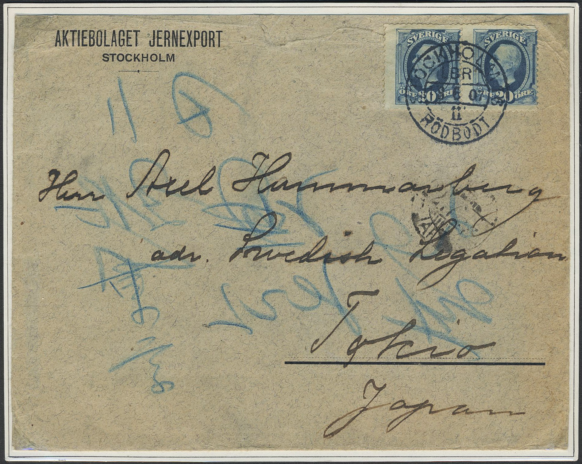 Sweden. Facit 56 on cover, 2×20 öre on cover sent from STOCKHOLM RÖDBODT 18.6.07 to Japan with arrival pmk on the reverse. Ex. Ingvar Larsson.