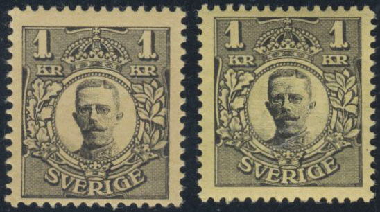 Sweden. Facit 77, 77vm1 ★★, 1 Krona black with inverted wmk crown + one ordinary. SEK 3600