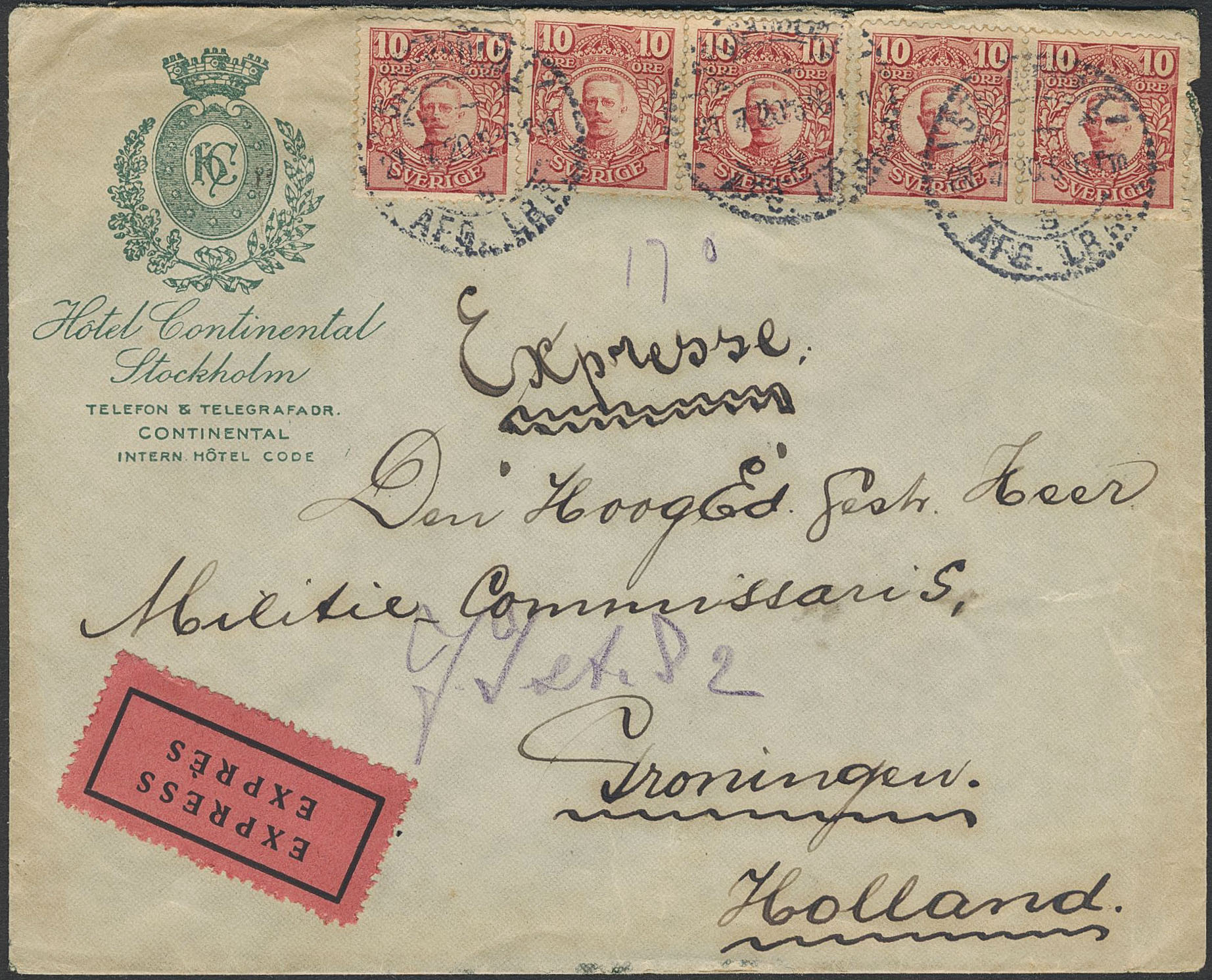 Sweden. Facit 82 on cover, 5×10 öre on cover 'Hotel Continental' with special delivery, sent from STOCKHOLM 1 21.7.20 to the Netherlands. Arrival pmk GRONINGEN 24.VII.20. The only recorded special delivery mail to the Netherlands pre-1930s according to Ferdén.