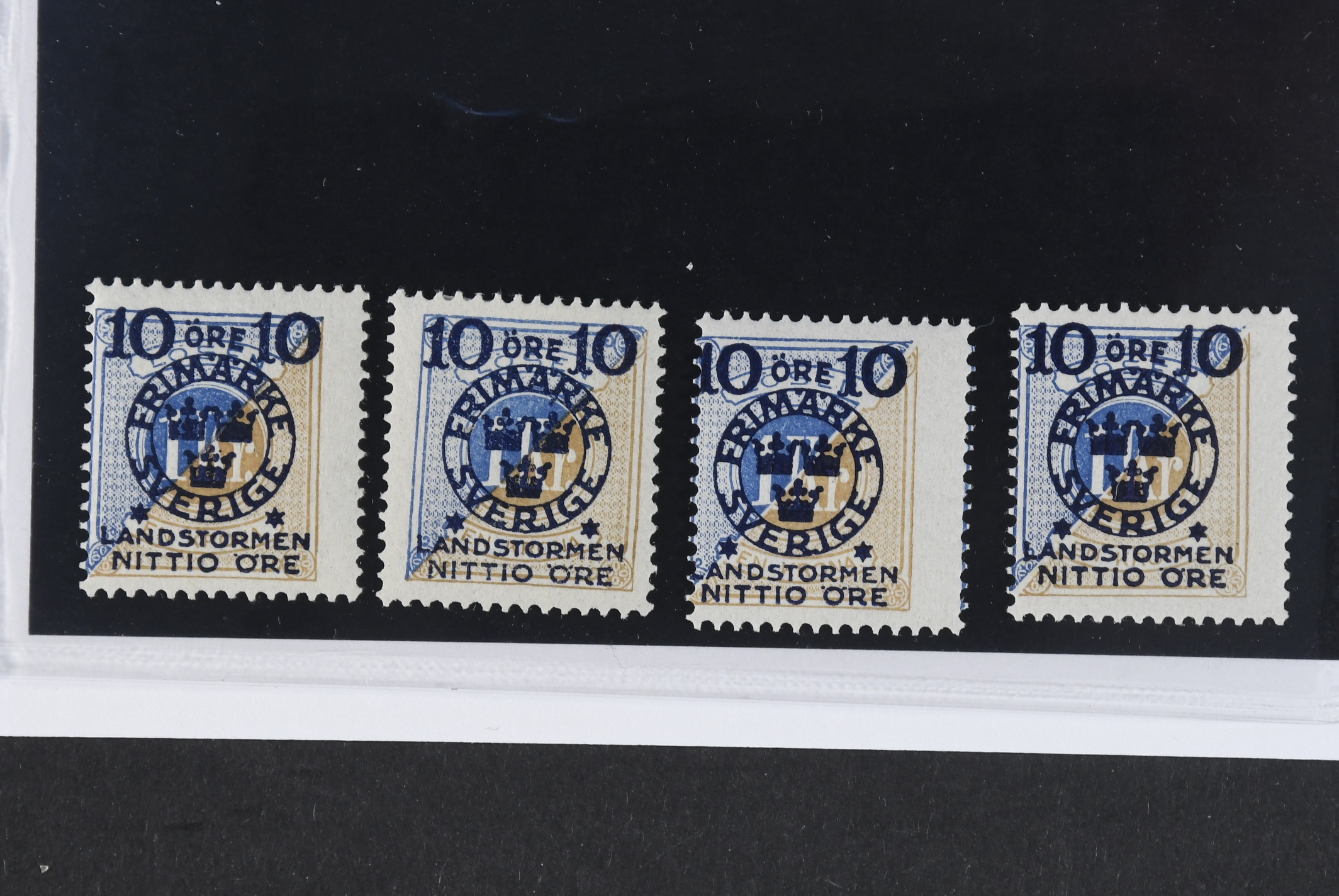 Sweden. Facit 124 ★★/★, 1916 Landstorm II 10+NITTIO / 1 kr blue/greyish brown. Three * and one **. SEK 5600