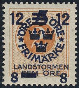 Sweden. Facit 126v3 ★★, 1916 Landstorm III 7+3 / 5+FEM / 2 öre orange '12+8' instead of '7+3'. Superb copy. SEK 2400