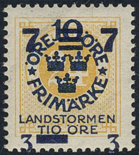Sweden. Facit 133v2 ★★, 1916 Landstorm III 12+8 / 10+TIO / 24 öre yellow '7+3' instead of '12+8'. Superb. SEK 2400
