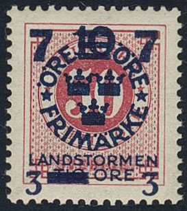 Sweden. Facit 135v2 ★★, 1916 Landstorm III 12+8 / 10+TIO / 50 öre carmine '7+3' instead of '12+8'. Excellent example. SEK 2400
