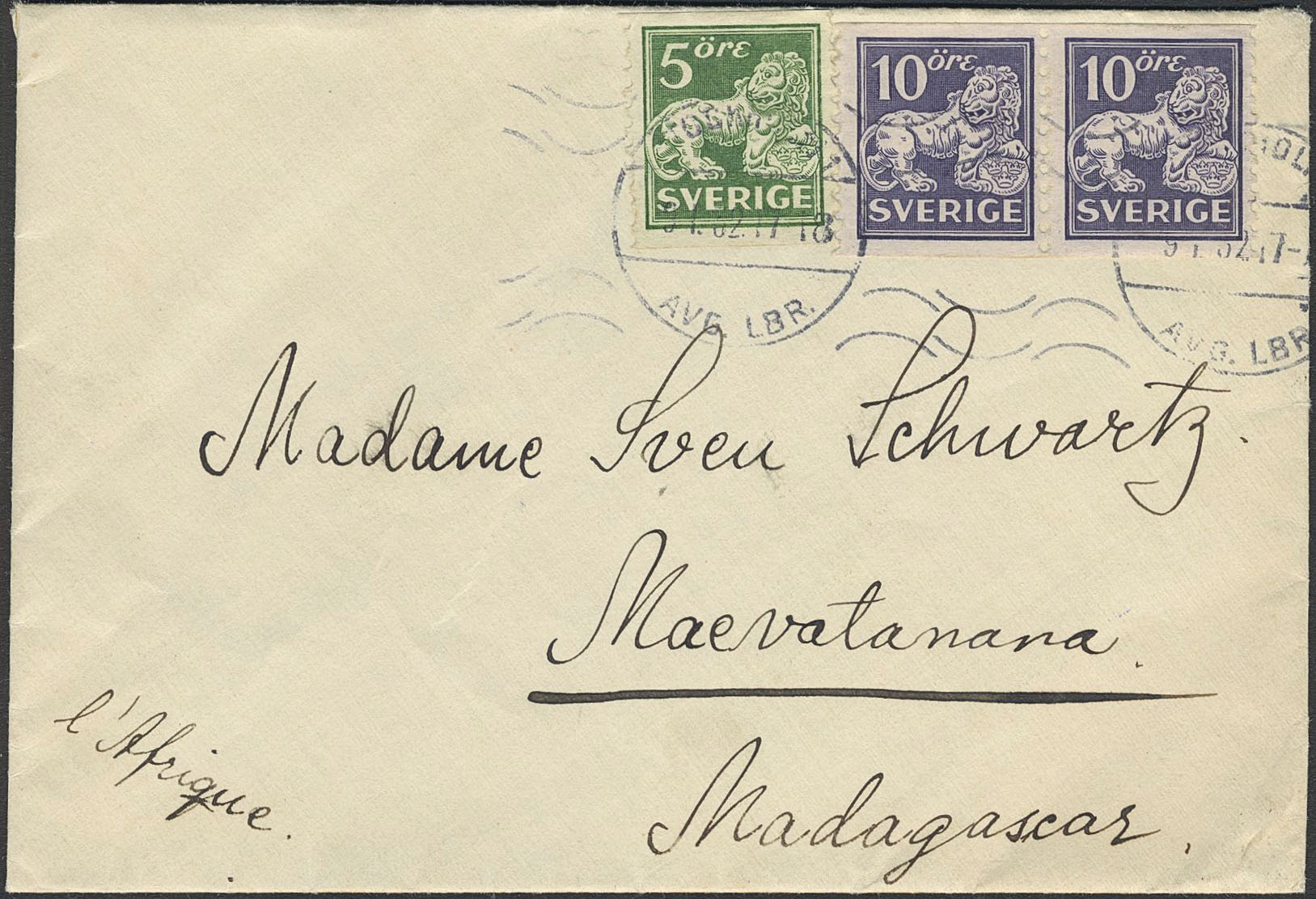 Sweden. Facit 146A, 143A on cover, 5+2×10 öre on cover sent from STOCKHOLM 1 9.1.32 to MAEVATANANA MADAGASCAR 19.FEVR.32. Scarce destination.