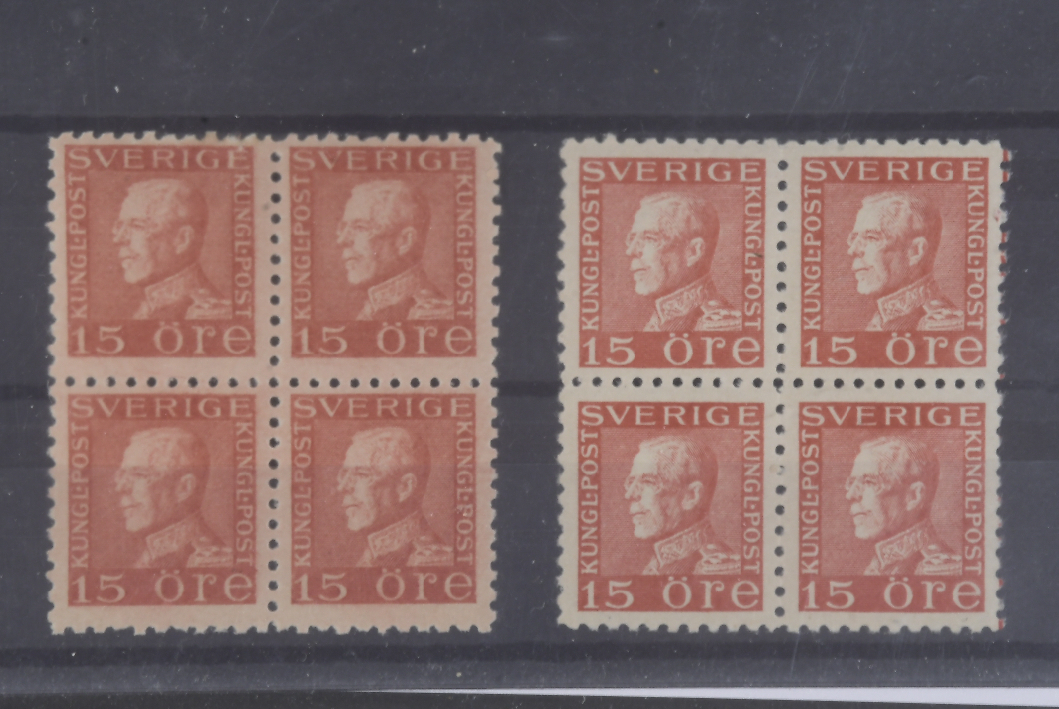 Sweden. Facit 176C, 177C ★★, 15 öre red type I and II. Two very fine blocks of four incl. type II with superb centering. SEK 5200++