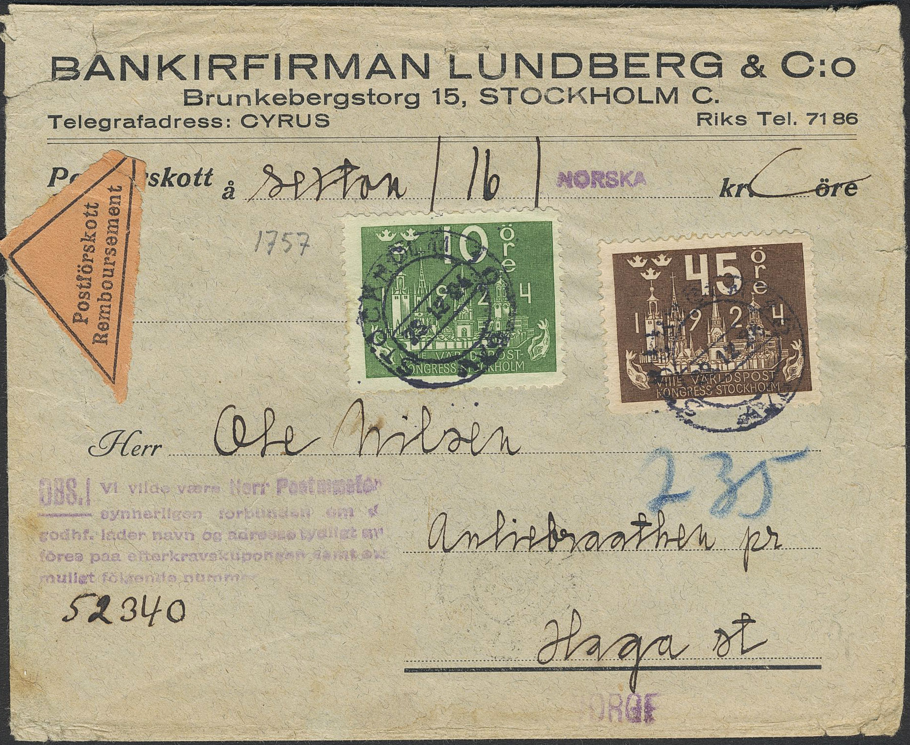 Sweden. Facit 197, 204 on cover, 10+45 öre on cash on delivery cover sent from STOCKHOLM 23.12.24 to Norway with arrival pmk KRISTIANIA 27.XII.24.