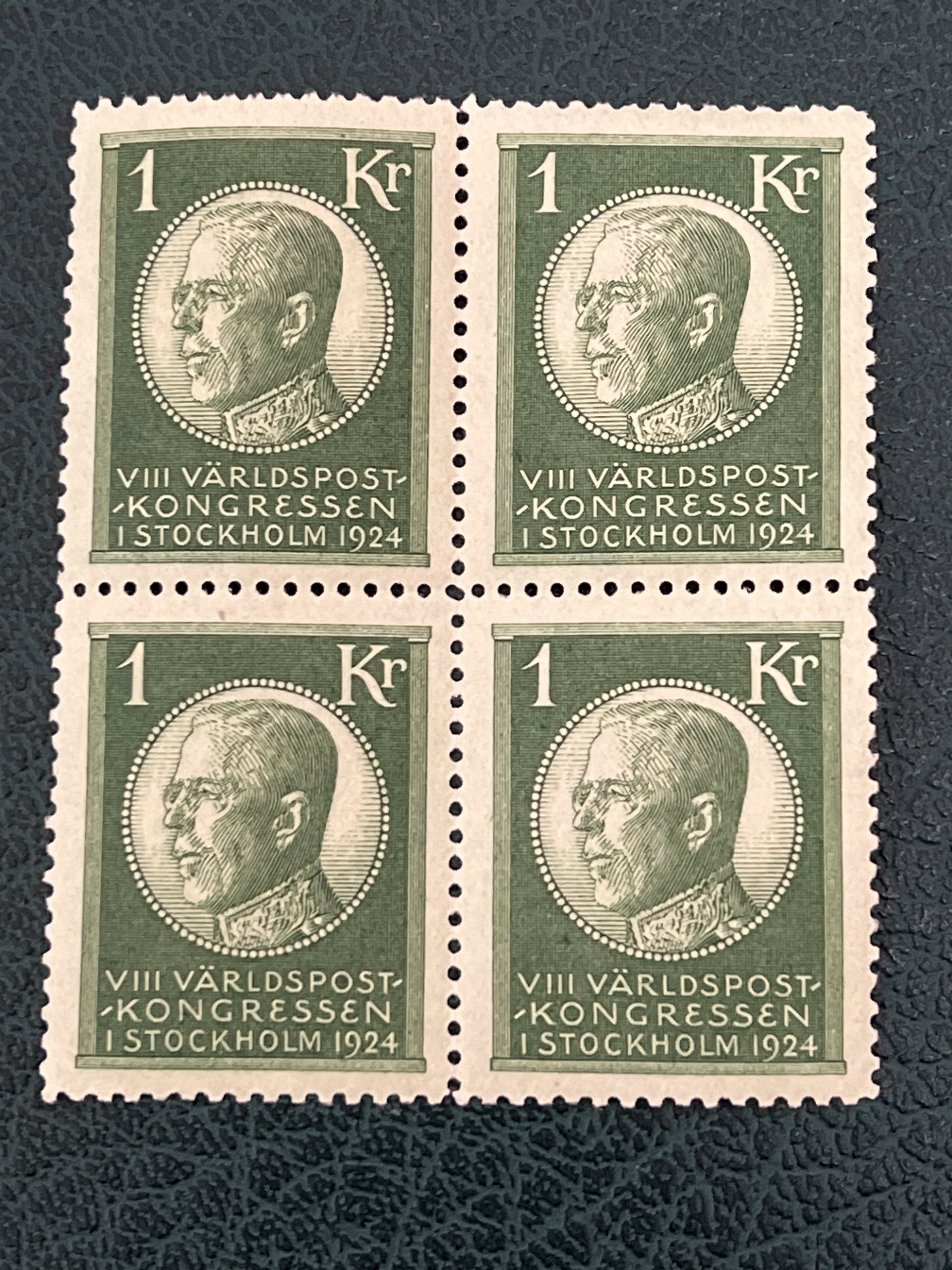 Sweden. Facit 208 ★★, Block of four. Fair centering. A couple of shorter perfs on the upper stamps. SEK 4000