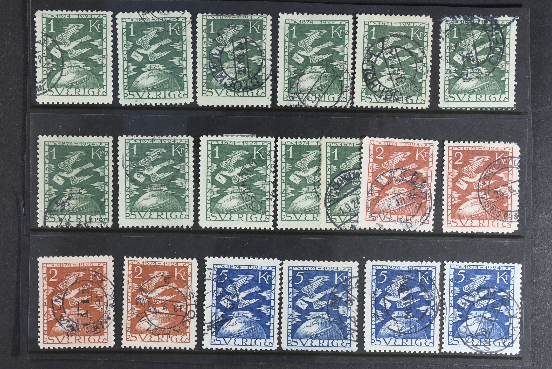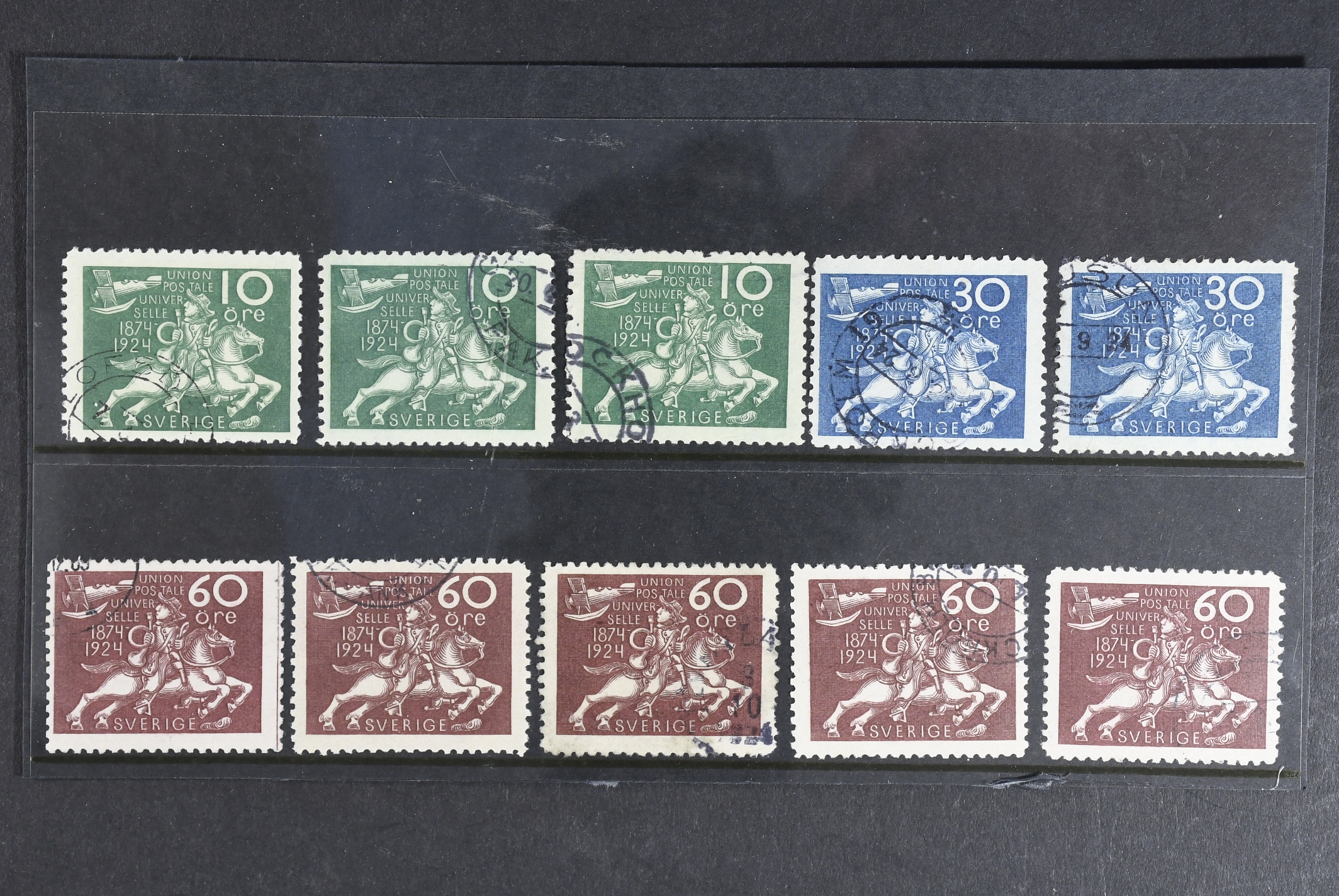 Sweden. Facit 223–25 used, 30, 30, 60 öre and 1–5 Kr. 29 stamps in mixed quality.