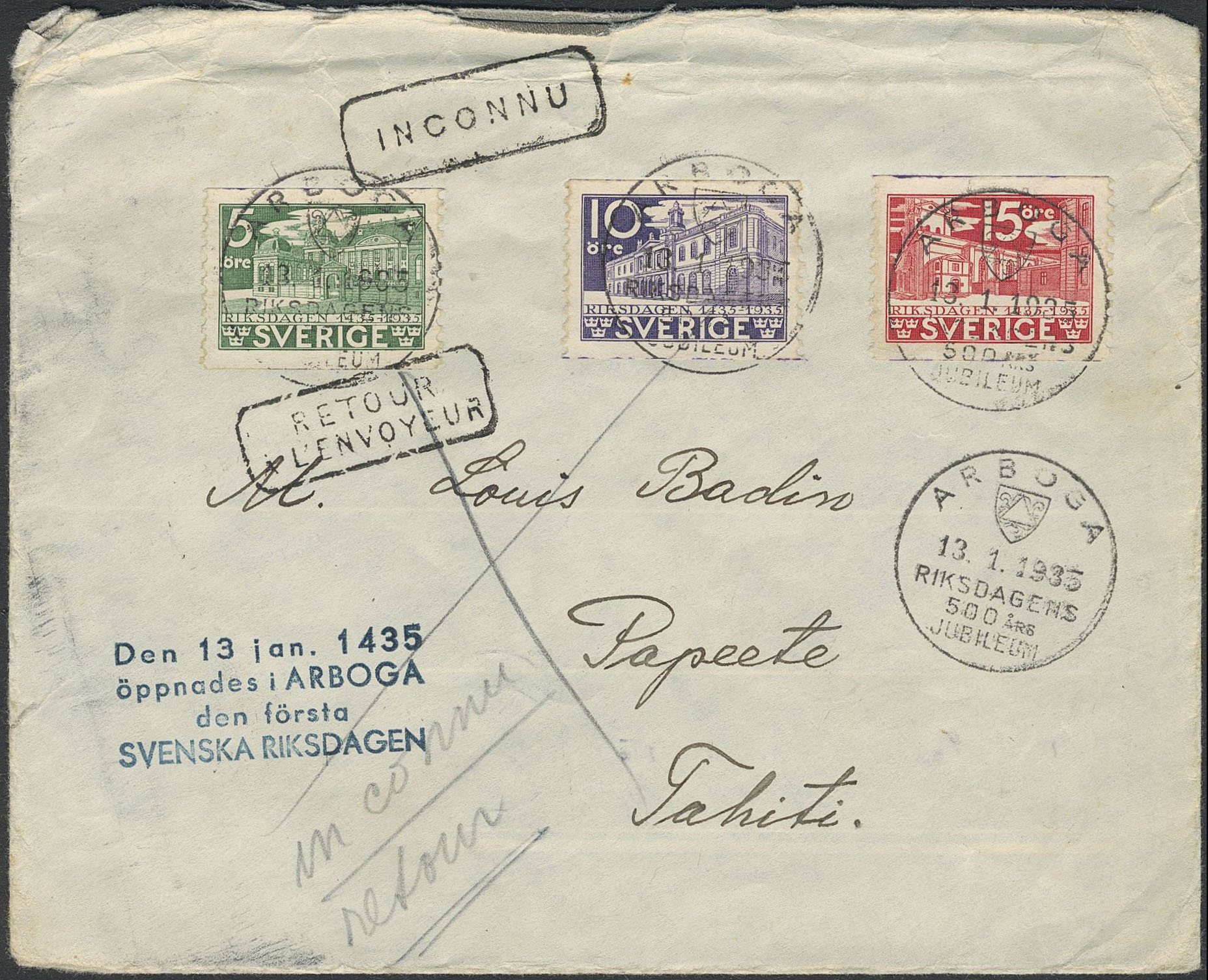 Sweden. Facit 240A, 241A, 242A on cover, 5+10+15 öre on cover sent from ARBOGA 13.1.1935 to PAPEETE ILE TAHITI 22.2.35. Undeliverable with pmks INCONNU and RETOUR À L'ENVOYEUR.