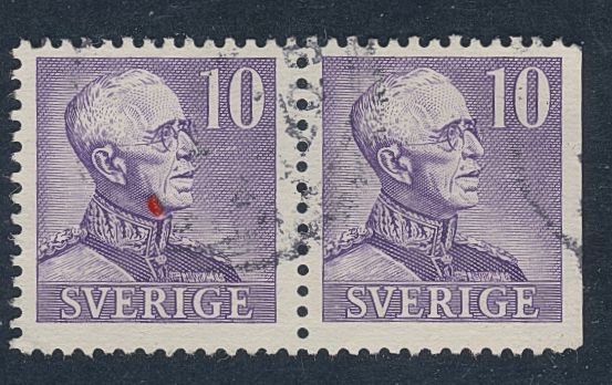 Sweden. Facit 273CB1 used, 1939 Gustaf V large numerals 10 öre violet, pair perf 4+3 sides with coloured line in coat lapel. Wide margins. SEK 2200