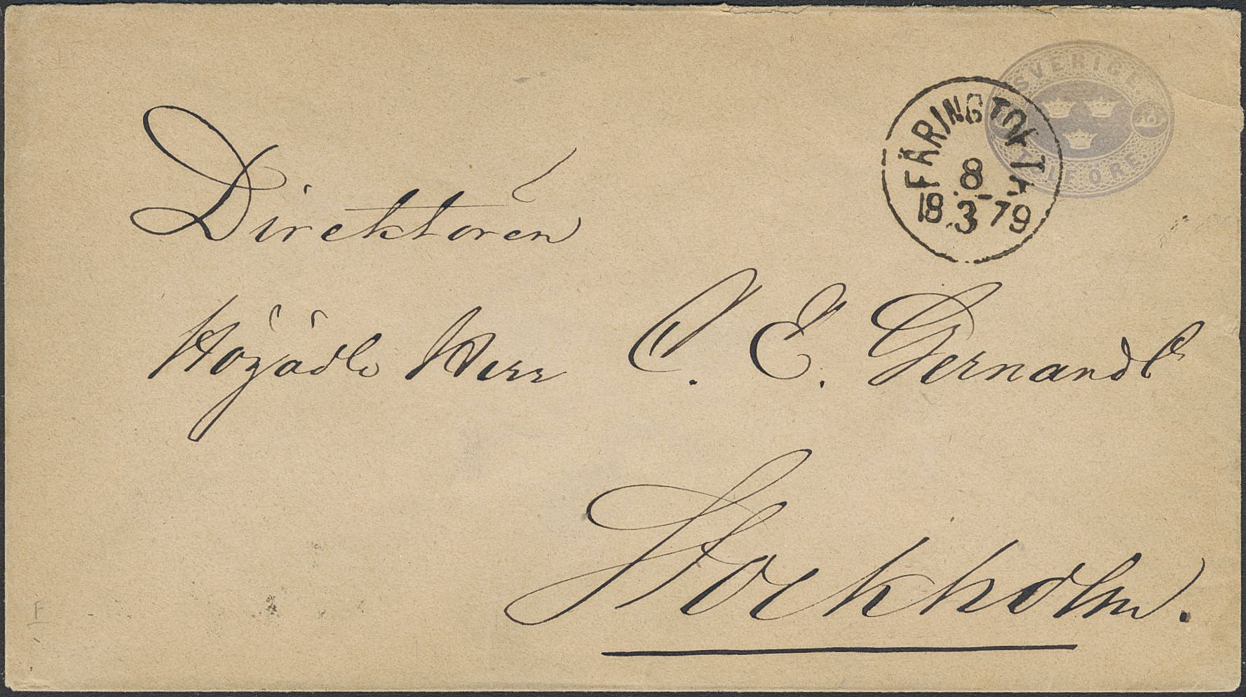 Sweden. Facit Fk1, L county. FÄGRINGTOFTA 8.3.1879. Beautiful stamped envelope 12 öre sent to Stockholm. Postal: 600:-