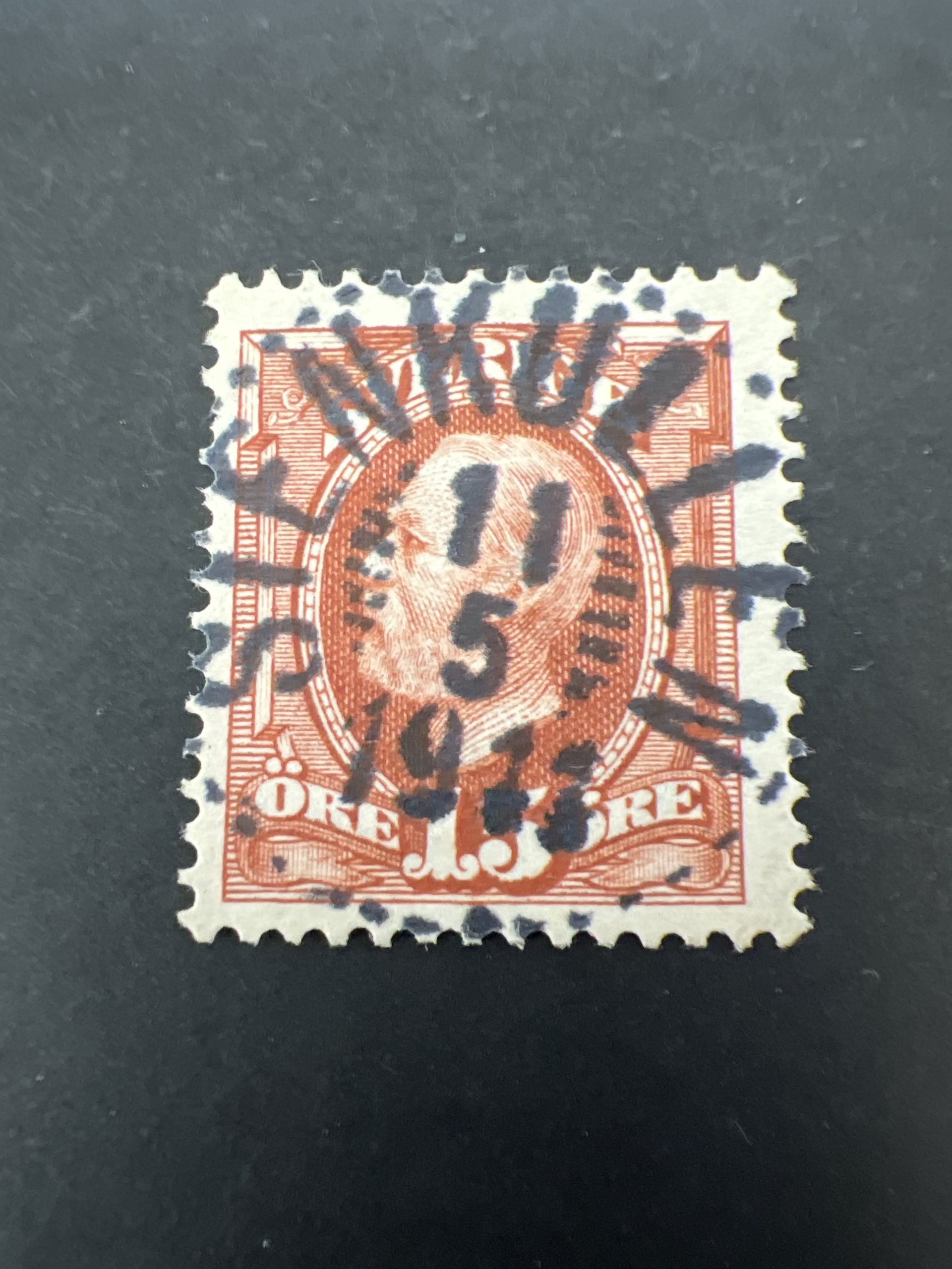 Sweden. Facit 55, P county. STENKULLEN 11-5-1911. Superb–excellent cancellation, however, one short perf. on the left. Postal: 800:-