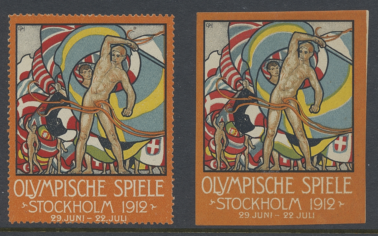 Sweden. Poster stamp Facit 66c ★★, Olympic Games, Stockholm 1912. German language IMPERFORATE, incl. perforate copy as comparison. Both mint ** in very fine condition (2).