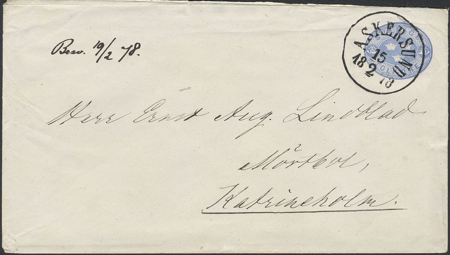Sweden. Postal stationery, Stamped envelope, Facit Fk1IIIf, Stamped envelope 12 öre type III clear ultramarine on white paper, sent from ASKERSUND 15.2.1878 to Katrineholm. Superb.