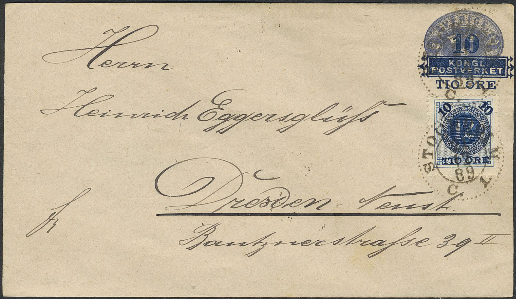 Sweden. Postal stationery, Stamped envelope, Facit Fk5, F50, Stamped envelope 10/12 öre additionally franked with 10/12 öre, sent from STOCKHOLM 21.12.89 to Germany. Arrival pmk DRESDEN 23.12.89.