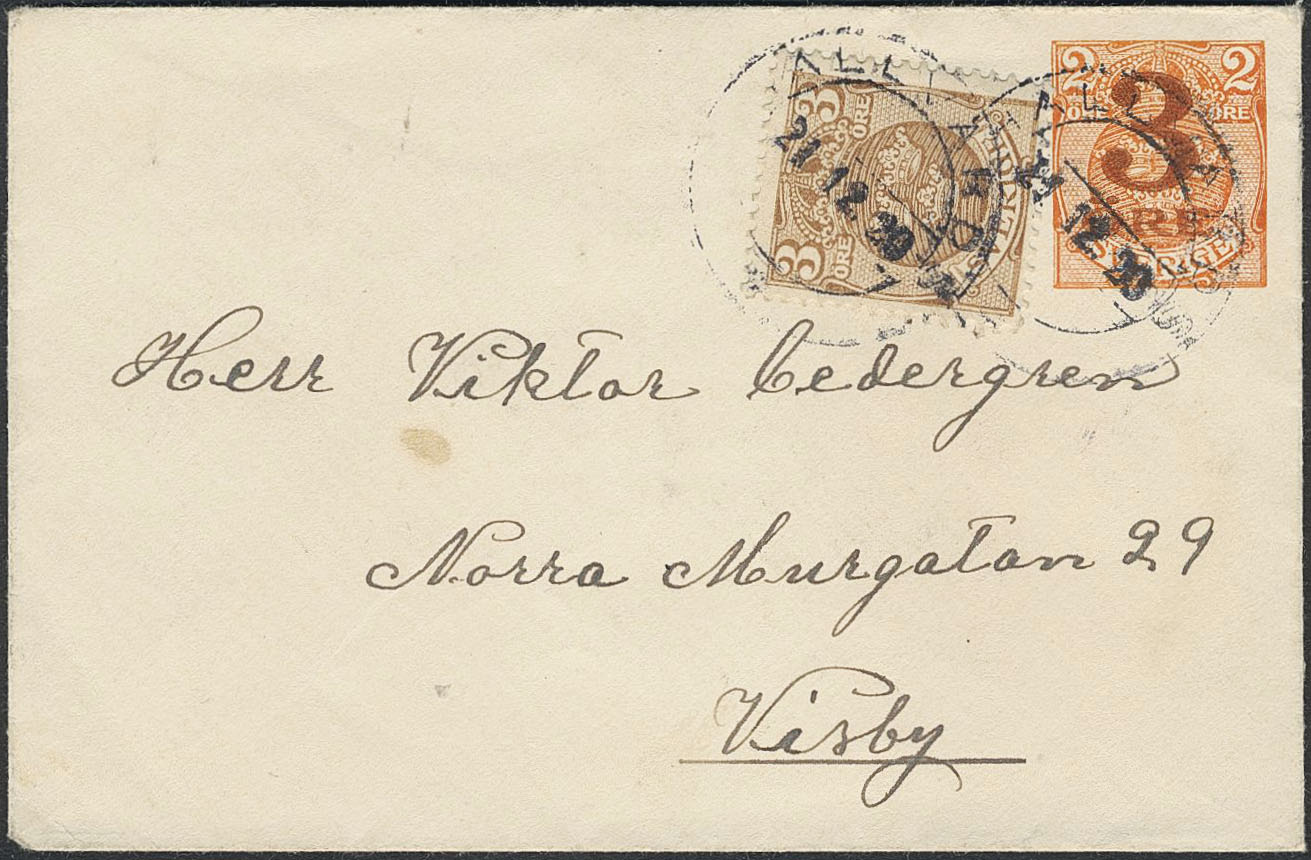Sweden. Postal stationery, Stamped envelope, Facit Fk18A, Stamped envelope 3/2 öre wm \\, additionally franked with 3 öre, sent from HALLVARDS 21.12.20 to Visby. SEK 2500