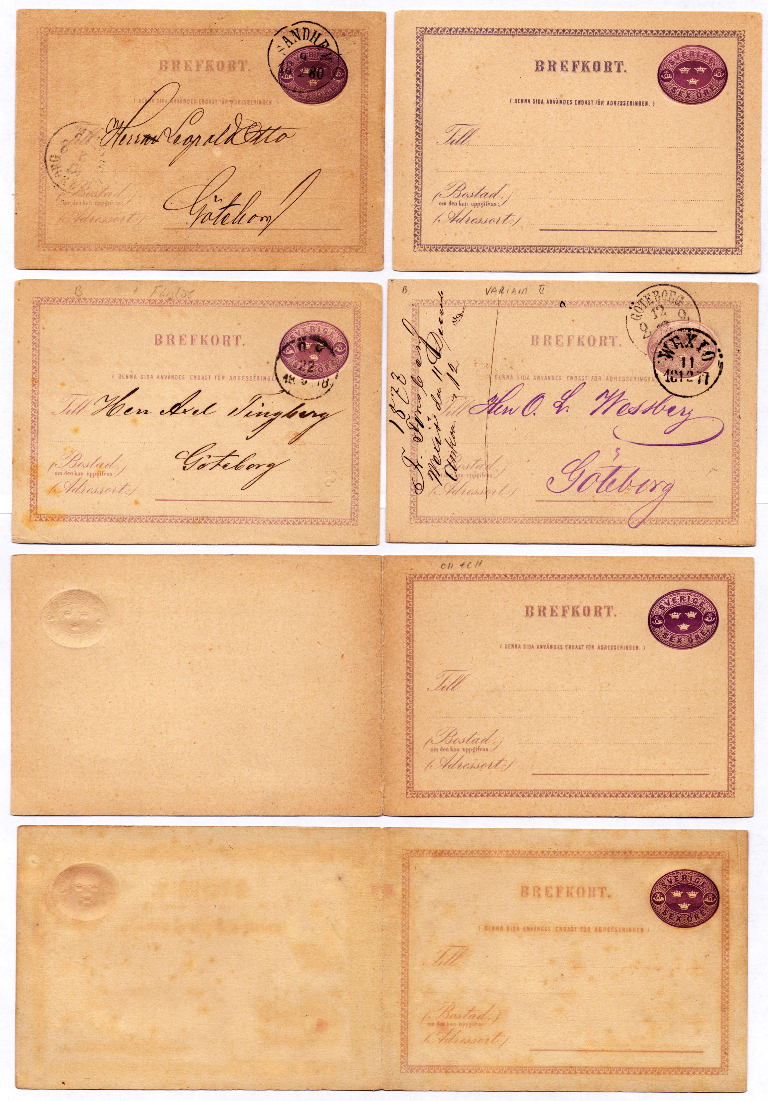 Sweden. Postal stationery, Single postcard, Facit bKe2 v.II, bKd1 v.V, VARIETY 'TWO INDICIUMS, ONE COLOURLESS' – Two used single cards type B, one used CI and one unused CII, plus unused double cards type CI+AI (dirty) and CII+CII. A few not so clear. Facit 21,000. The entire lot is presented at www.philea.se. (6).