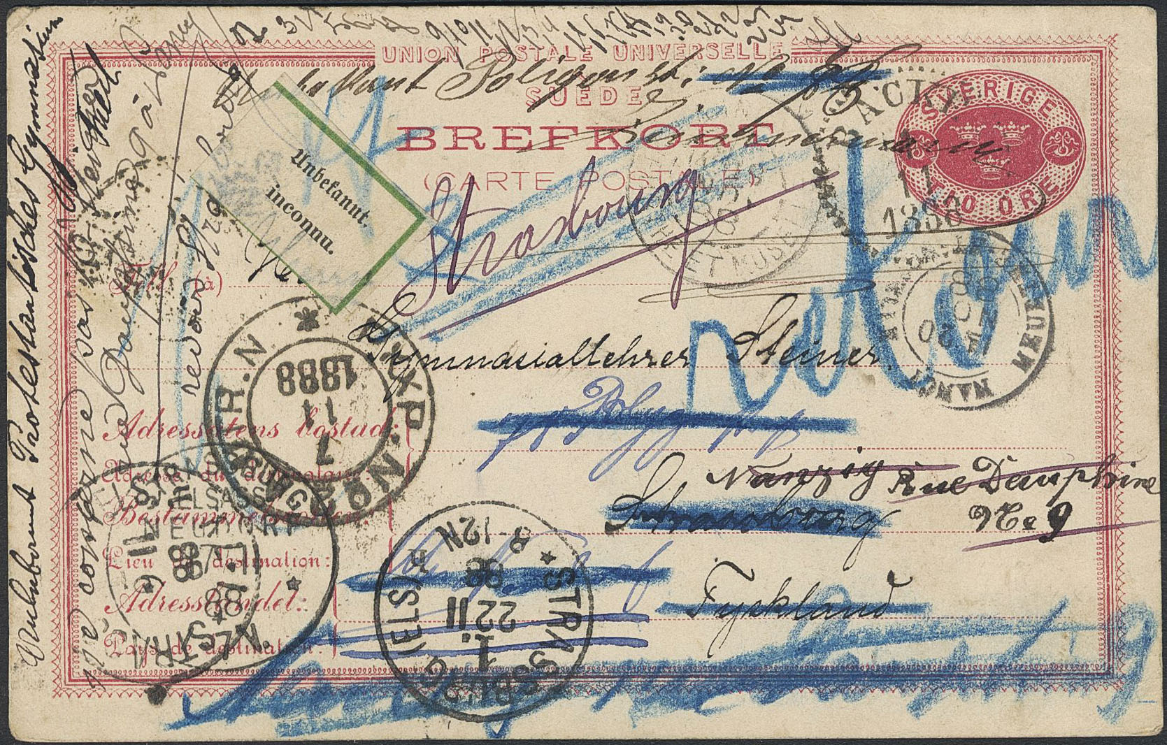 Sweden. Postal stationery, Single postcard, Facit bKe4, Postcard 10 öre sent from BACKE 1.11.1888 to Strasbourg, then forwarded several times, but in the end undeliverable with label 'Unbekannt. inconnu'.