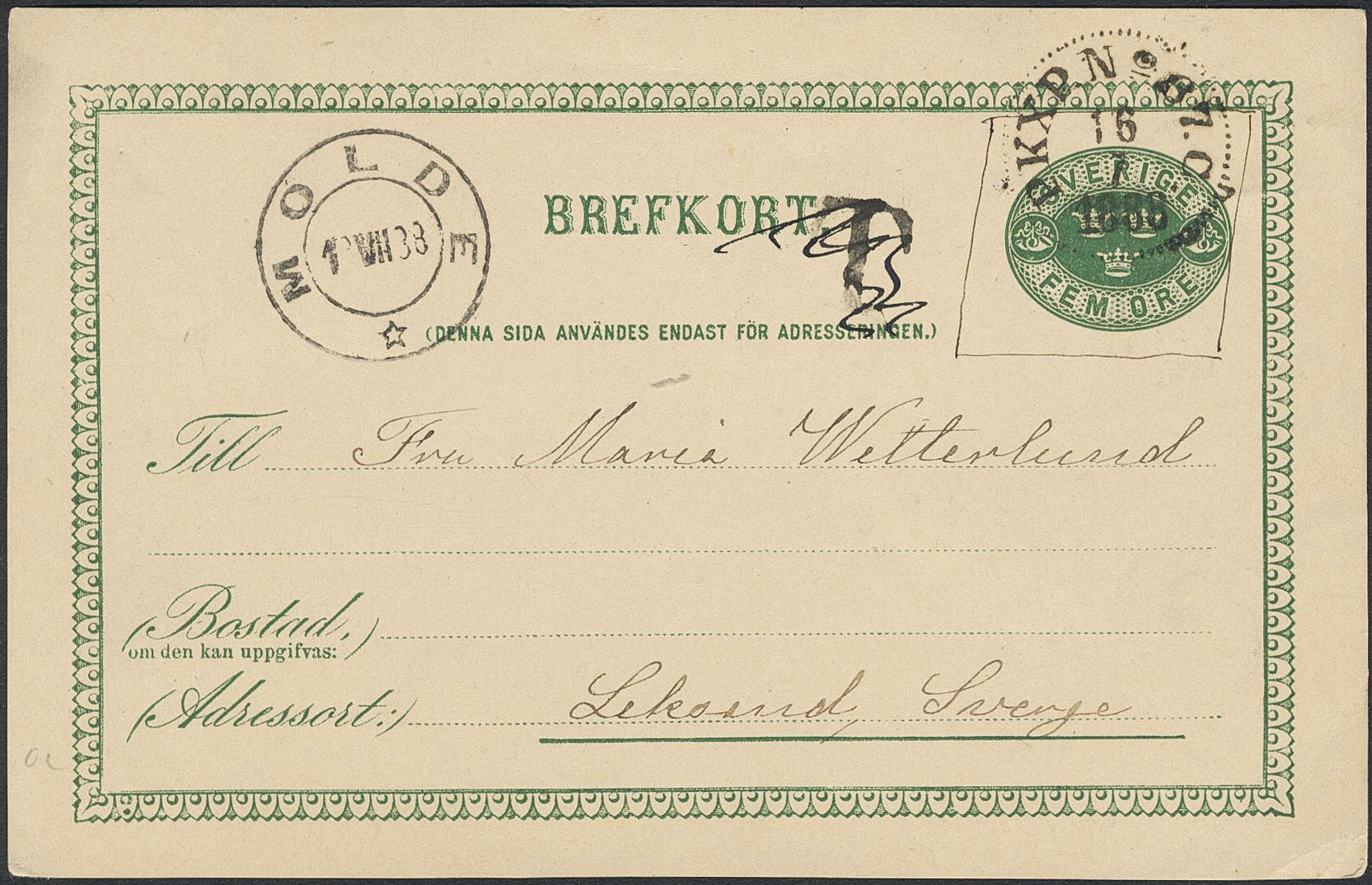 Sweden. Postal stationery, Single postcard, Facit bke7, Postcard 5 öre sent from MOLDE 1x.VII.88, Norway, taxed as unvalid, but later seemingly approved. Also cancelled PKXP No 67C 16.7.1888. Interesting item.