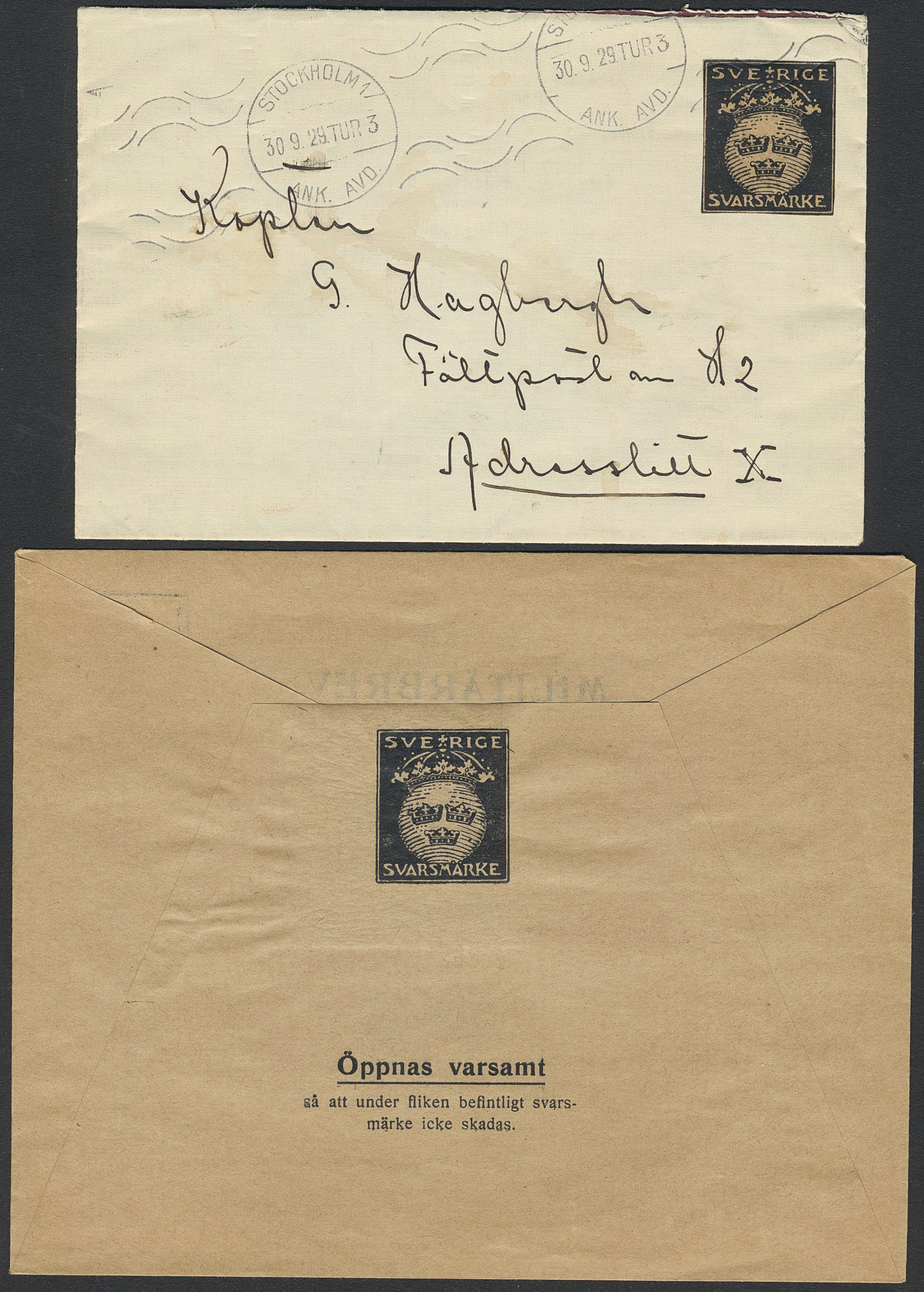 Sweden. Military postal stationary Facit M1, One unused military cover and one reply-stamp usage on cover cancelled STOCKHOLM 1 30.9.29. (2).